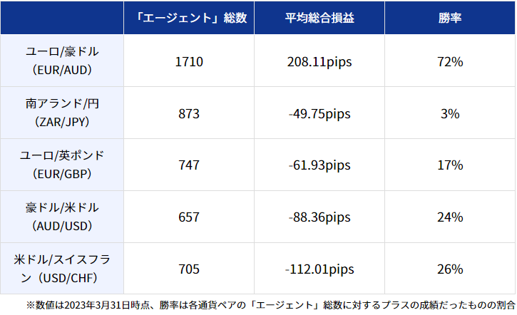 ここで紹介している通貨ペアの平均総合損益ランキングは、利益を出している・出していないにかかわらず各通貨ペアの全「エージェント」の成績をもとにしています。中にはしっかりと調子を上げている「エージェント」はいますが、取引に苦しんだ「エージェント」も少なくありませんでした。