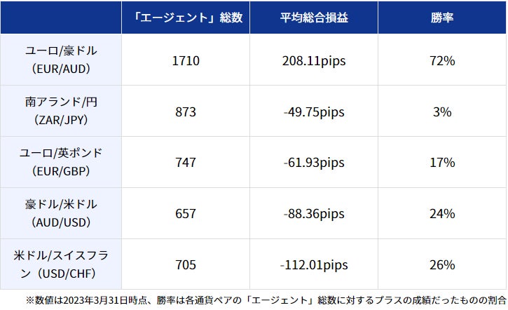 そうした相場で「エージェント」の成績はどうだったのか。「エージェント」の動向を項目別に紹介するので、本レポートを採用する通貨ペア選びの参考にしてください。