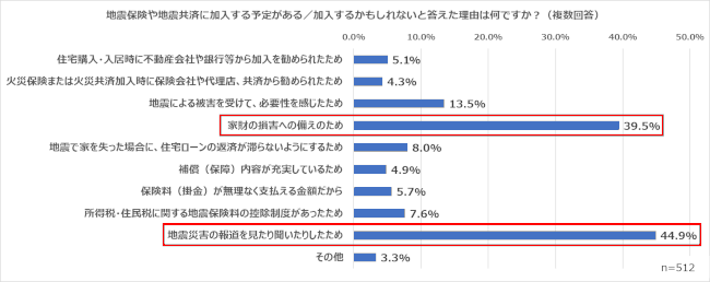 ■「地震保険や地震共済に加入する予定がある/加入するかもしれない」と回答した人(512名)が加入を検討している理由(複数回答)