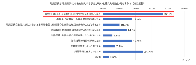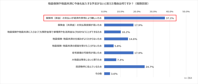 次に、地震保険や地震共済に「加入する予定がない」あるいは「今後も加入しない」と回答した人(364名)に、その理由を訊ねました。