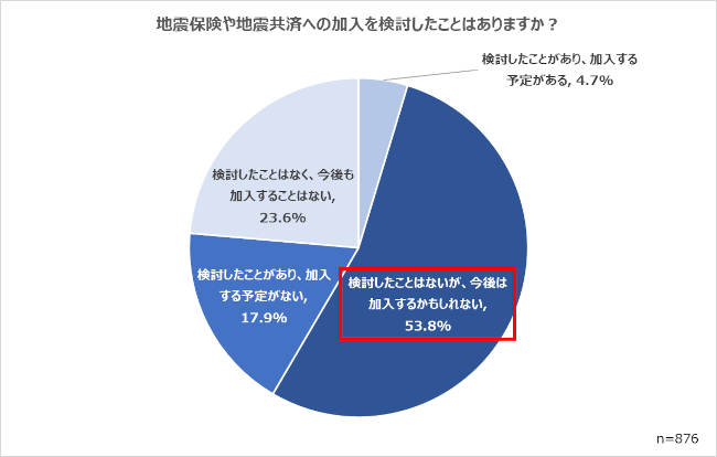 今回の調査より、地震保険/地震共済に加入していないものの、今後加入を検討している人が半数以上いることがわかりました。