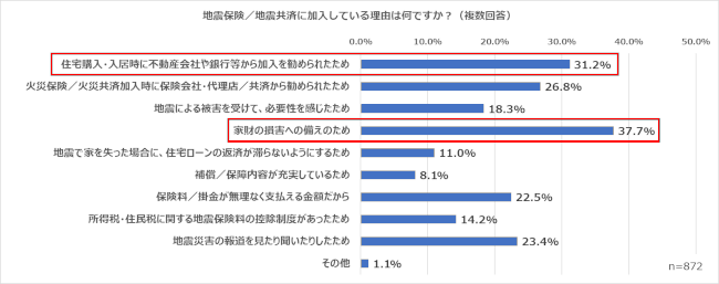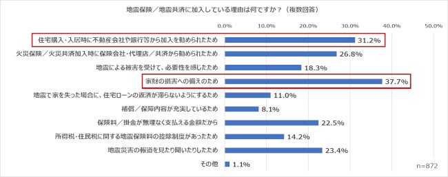続いて、「地震保険/地震共済に加入している」と回答した人(872名)へ、「地震保険/地震共済に加入している理由は何ですか?(複数回答)」と訊ねました。