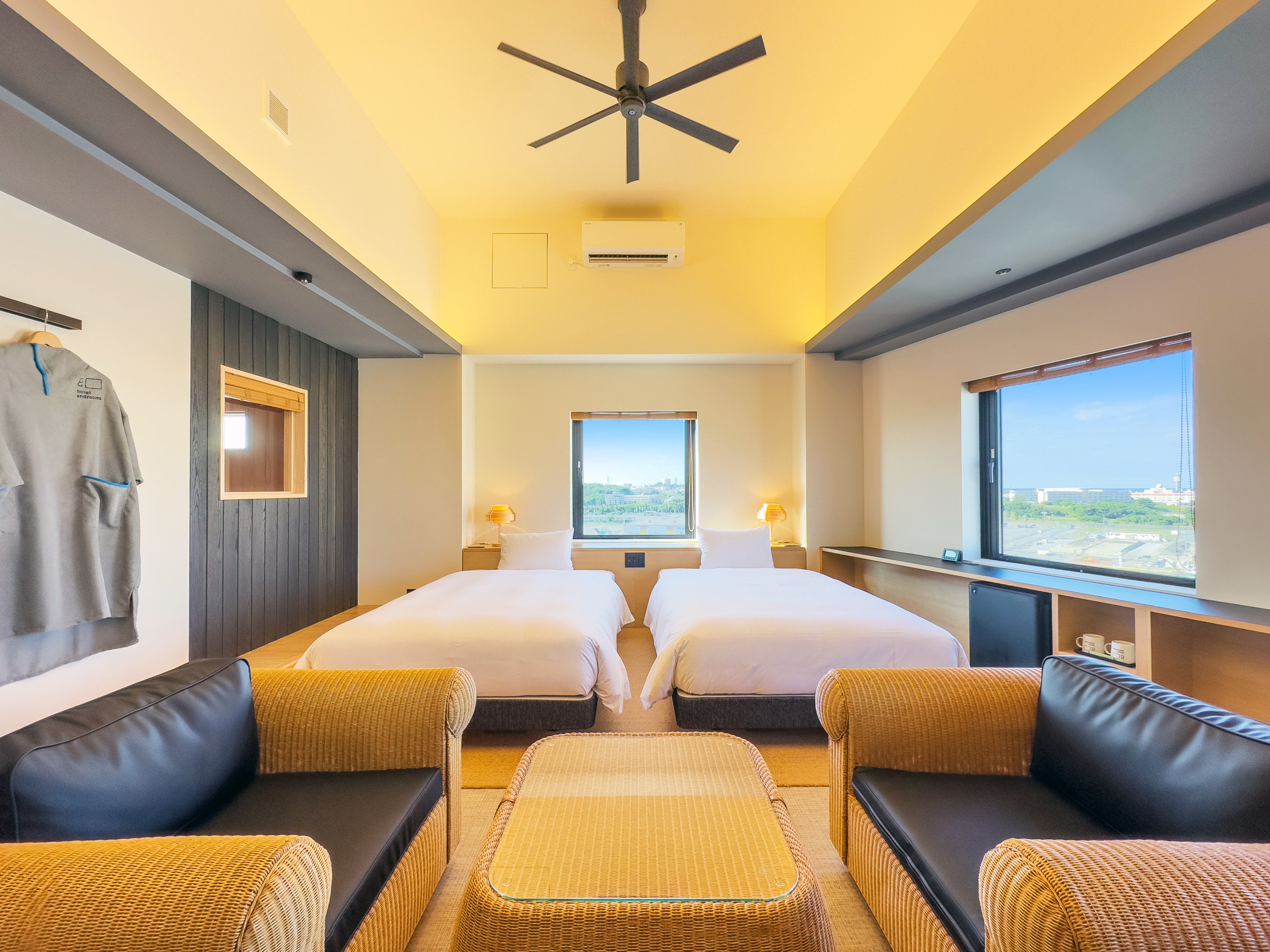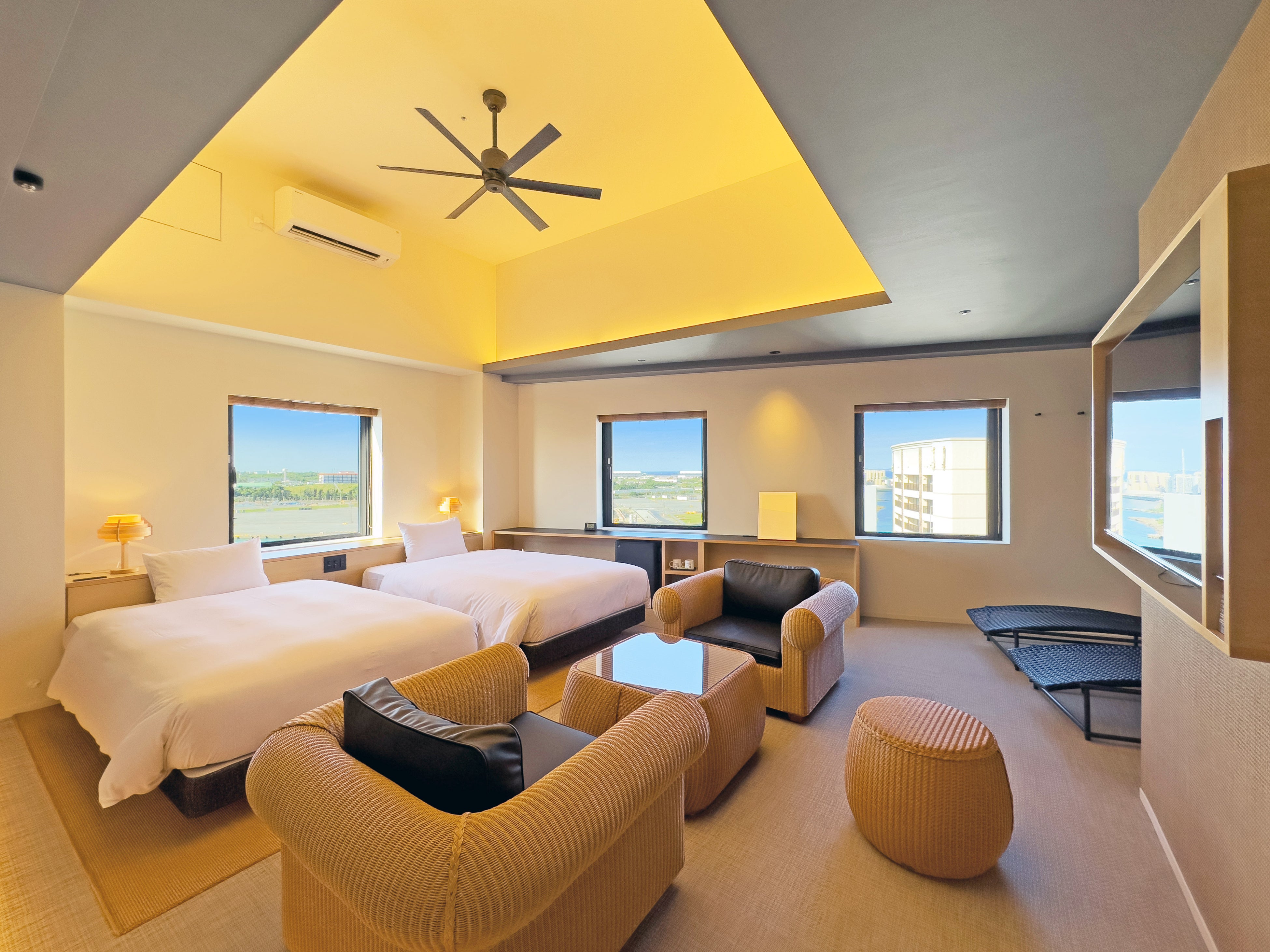ホテルの最上階に位置し、那覇市内では初のセルフロウリュ対応のプライベートサウナを備えたプレミアツインの客室で、ドライエリアには“ととのいチェア”を設置。人目を気にせず自分のペースで“ととのう”至福の時間をお過ごしいただけます。