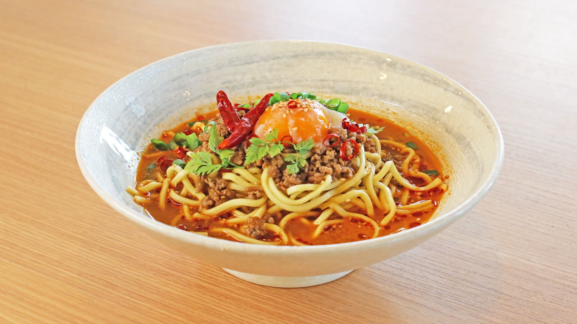 麺とスープの相性が抜群な沖縄そば麺を使用した坦々麺。塩味×甘味×辛味が相まる味のインパクトはやみつきになること間違いなしです。