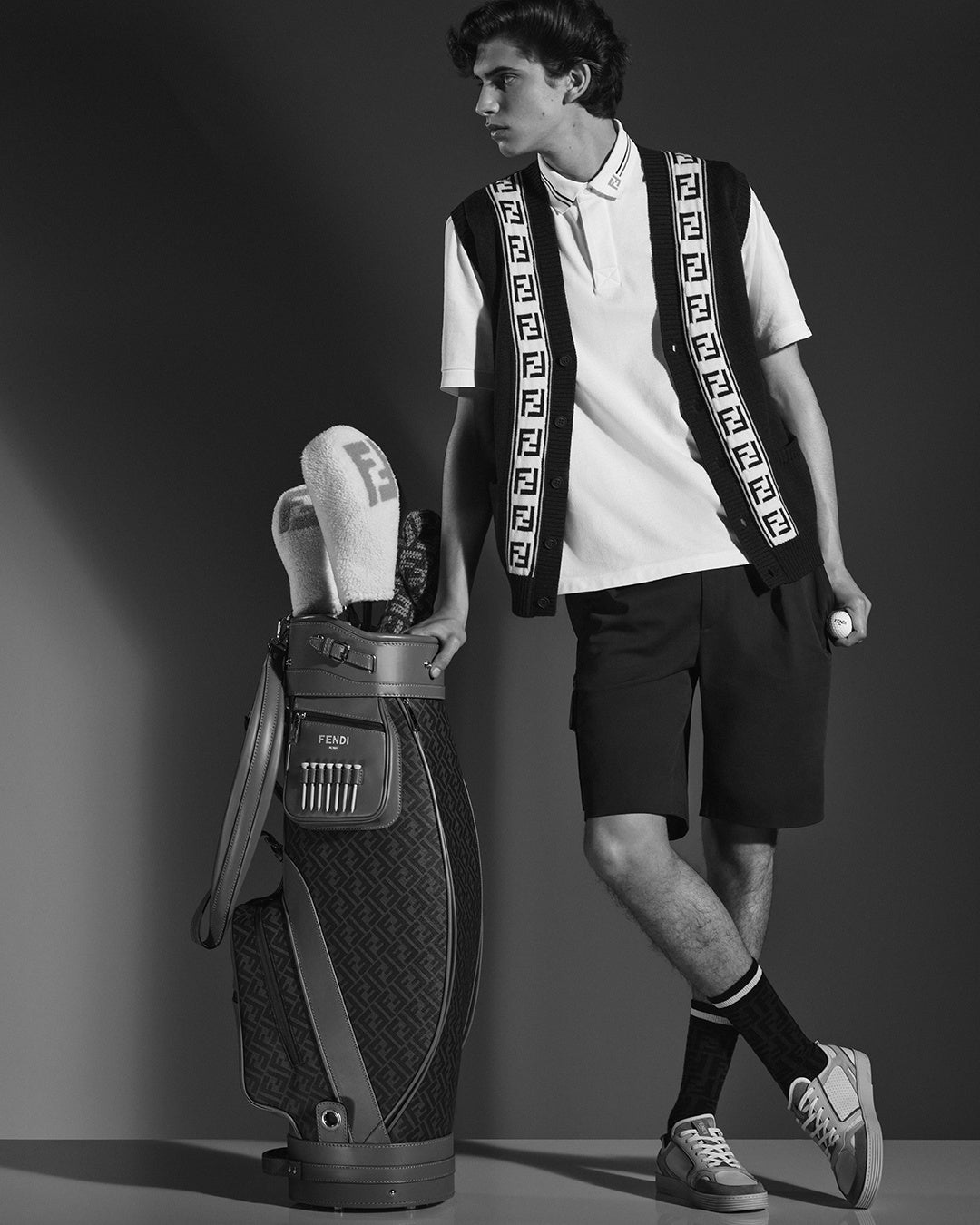 ブラックの「クオイオ ローマ(Cuoio Roma)」 レザー、またはクラシックなタバコカラーの「FF」ロゴがあしらわれたファブリック製のゴルフバッグを含む、大胆で楽しいアクセサリーも登場いたします。「FENDI」ロゴがデザインされた「キャロウェイ(Callaway)」社の3つのゴルフボールと、4本の木製ティーホルダーのセットに加えて、ゴルフコースの芝生のボールマークを補修するための、「FF」ロゴが刻まれたメタルディボットも揃います。ゴルフクラブカバーのセットは、イエローの「FF」ロゴインターシャがあしらわれたホワイトのシアリング製で、ハイブリッド、ドライバー、木製クラブ用の3つのサイズが揃います。