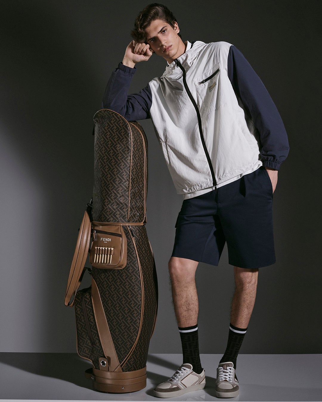 ベージュやネイビーブルーなど上品なカラーパレットが、クラシックなゴルフウェアを彩ります。襟元にさりげなく「FF」ロゴがあしらわれた半袖のポロシャツは、ブルーまたはホワイトのバミューダパンツや、フロントに2本の縦縞「FF」ロゴバンドがあしらわれたお揃いのニットジレと組み合わせることが可能で、アジュールのフード付きリバーシブルレインジャケットがルックを完成させます。イエローとホワイトを組み合わせた新しい「フェンディ ローマ(FENDI Roma)」ロゴがナイロンジャケットと同様に、長袖のコットンポロシャツにプリントされています。