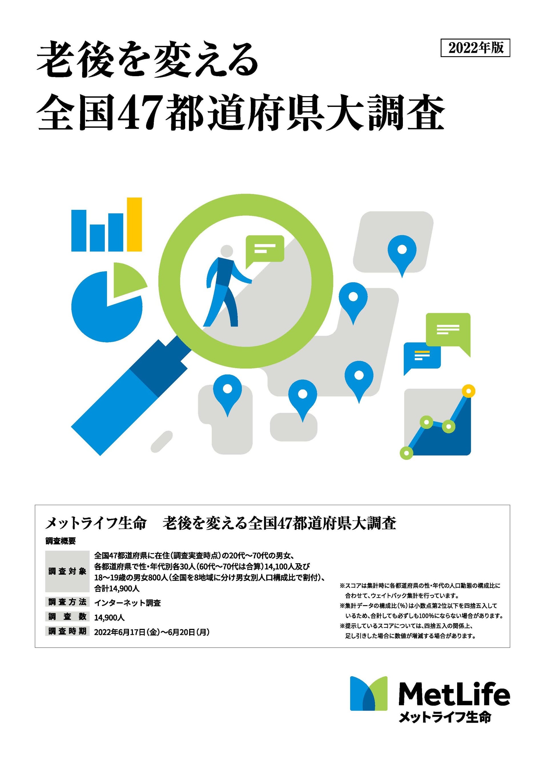 メットライフ生命保険株式会社(代表執行役 会長 社長 最高経営責任者 ディルク・オステイン)は9月2日、「老後を変える全国47都道府県大調査2022」の結果を発表しました。全国の18歳~70代までの男女14,900人を対象にして、老後や人生観について調査しました。