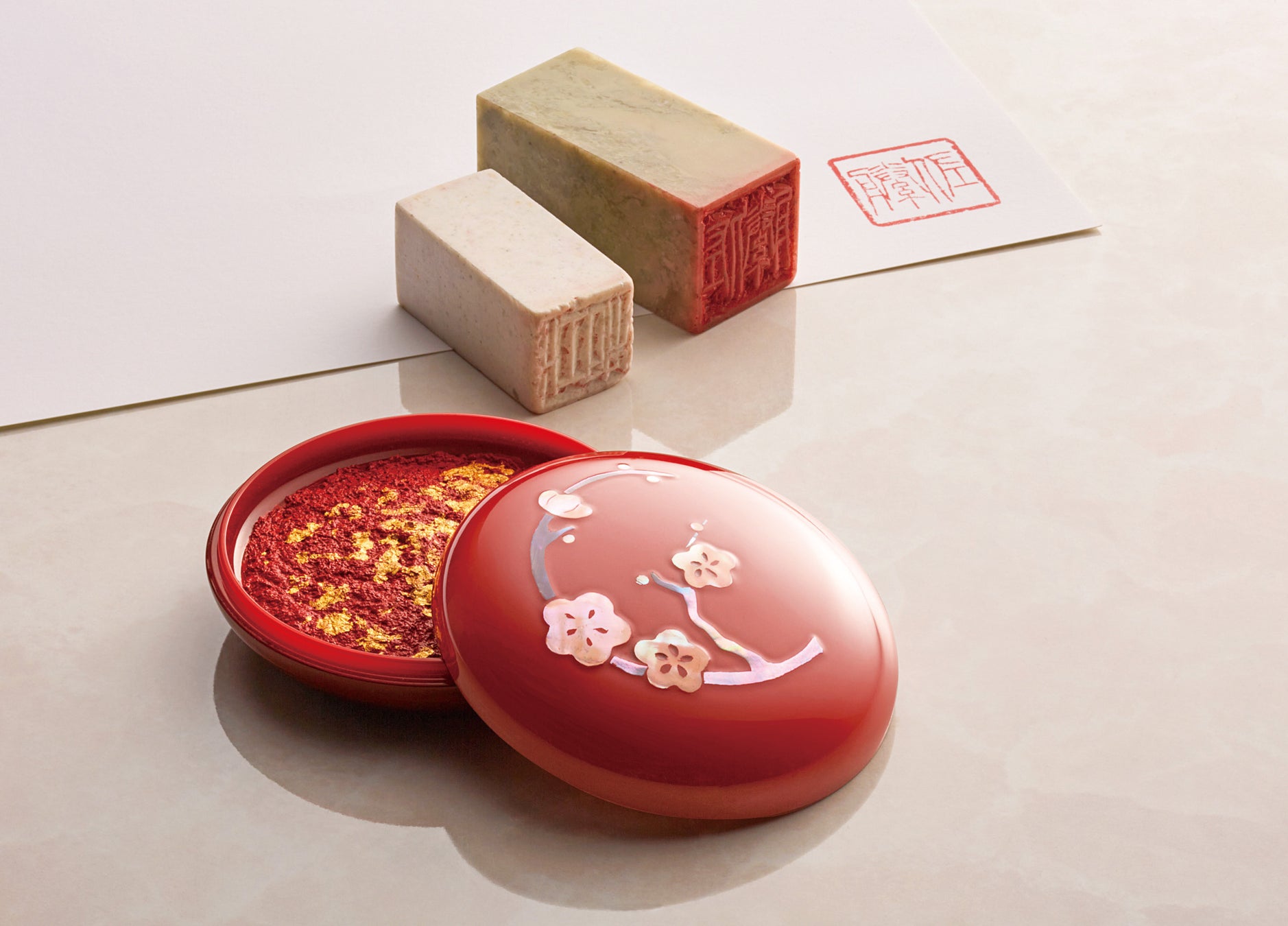 伝統的工芸品の「高岡漆器」を容器に使用した品格のある極上練朱肉 「高岡漆器 螺鈿仕上 鯱旗印肉」(たかおかしっき らでんしあげ しゃちはたいんにく)発売