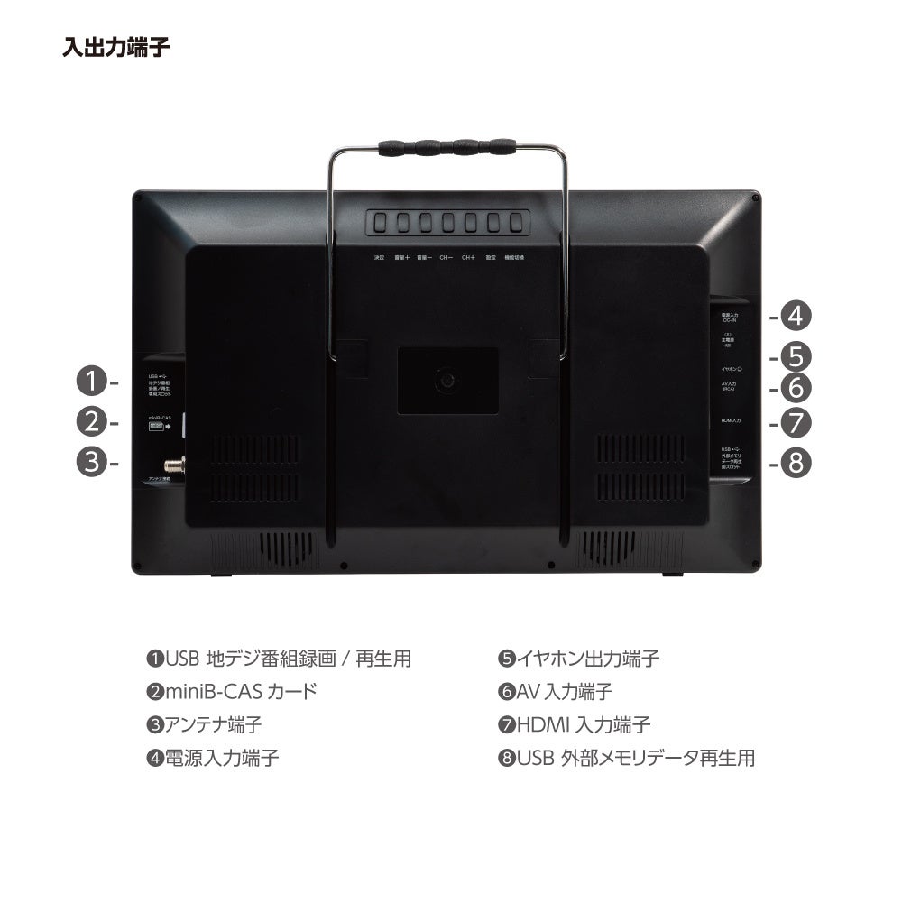 入力端子:アンテナ、DC電源、USB×2(番組録画・メディア再生)、AVイン、HDMI、miniB-CASカードスロット