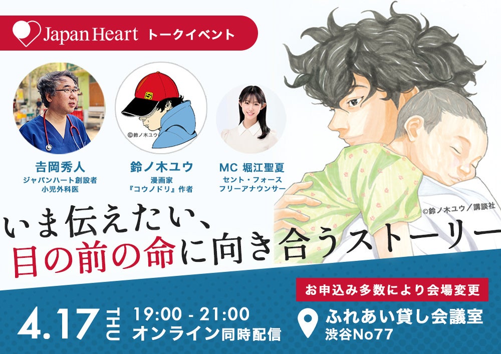本イベントは、リアルな産科医療の現場を描きドラマ化もされた人気医療漫画『コウノドリ』の作者で漫画家の鈴ノ木ユウ氏をゲストに招き、「ジャパンハートの医療の信条」と「コウノドリの世界観」に共通する“目の前の命のストーリー”をテーマに、ジャパンハートの創設者として30年間途上国の医療現場で活動を続ける小児外科医・𠮷岡秀人との対談を繰り広げます。