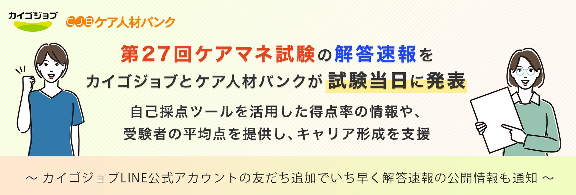 株式会社エス・エム・エス(本社:東京都港区、代表取締役社長:後藤夏樹、東証プライム、以下「当社」)は、介護職向け求人情報サイト「カイゴジョブ」(URL:https://www.kaigojob.com/)、およびケアマネジャー・相談員向け人材紹介「ケア人材バンク」(URL:https://www.carejinzaibank.com/)を提供しており、2024年10月13日(日)に実施される「第27回(2024年度)介護支援専門員実務研修受講試験」(通称:ケアマネ試験、ケアマネジャー試験)の解答速報をそれぞれのサービスサイトにて試験当日に公開いたします。