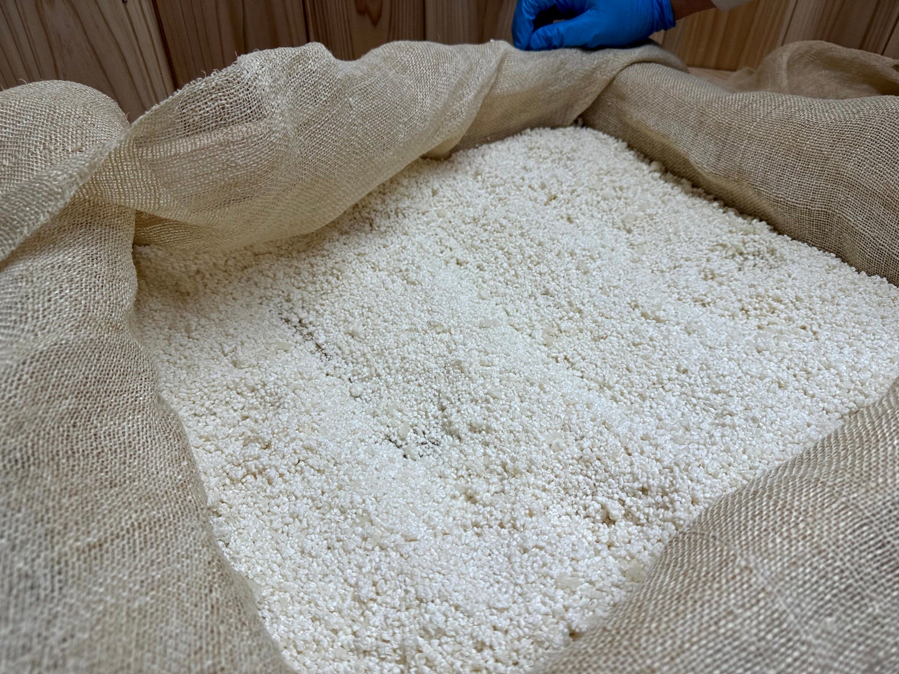 天空農園で収穫した玄米を精米歩合50%まで磨いた後、いよいよ酒造りが始まります。今回は、白鶴酒造資料館内に2024年9月にオープンしたマイクロブルワリー<HAKUTSURU SAKE CRAFT>で仕込みました。わずか15キロほどしかない貴重な白米を、一粒も無駄にしないように細心の注意を払いながら、すべて手作業で仕込みました。100Lの小さなタンクで約2ヵ月かけ大切に醸しました。圧搾機から出てきたお酒は非常に華やかで爽やかな味わいで、納得のいくものができてほっとしています。米作りから酒造りまで、心を込めて大切に造られた「白鶴 翔雲 純米大吟醸 銀座天空農園 白鶴錦」、是非ご賞味ください!