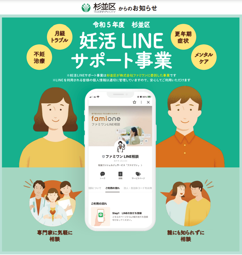また、開催場所である東京都杉並区では、2021年より「妊活LINEサポート事業」をファミワンが受託し、不妊症看護認定看護師や臨床心理士など専門家によるアドバイスを3回まで無料で受けることができます。