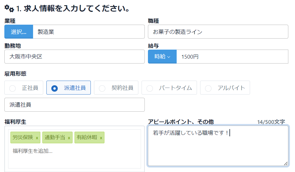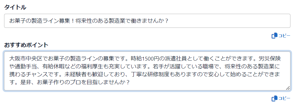 人材派遣や人材紹介業界などにおける文章作成業務の手間とストレスを軽減、元の情報量が少ない場合も「ええ感じ」に肉付けした案を出してくれます。