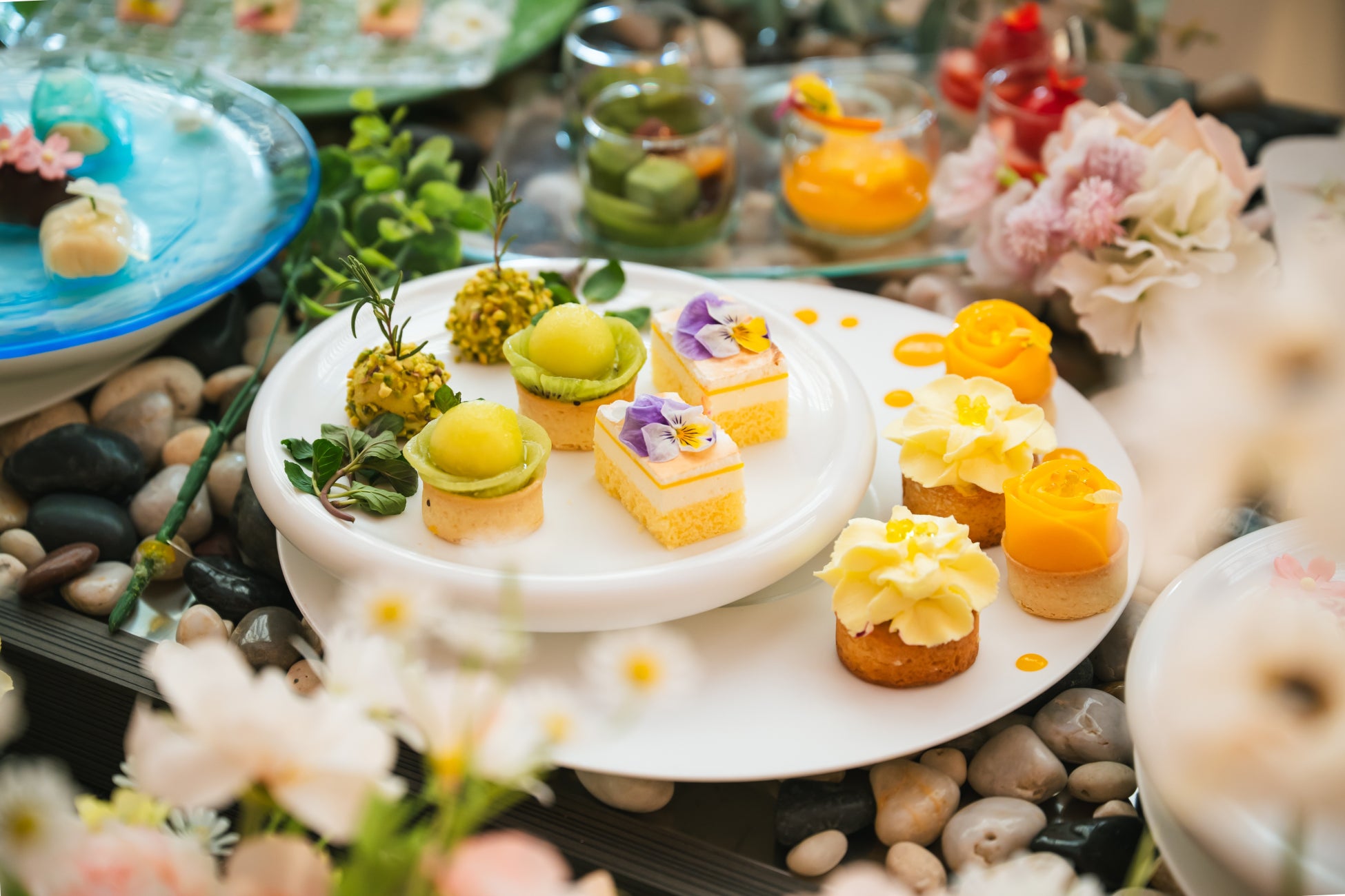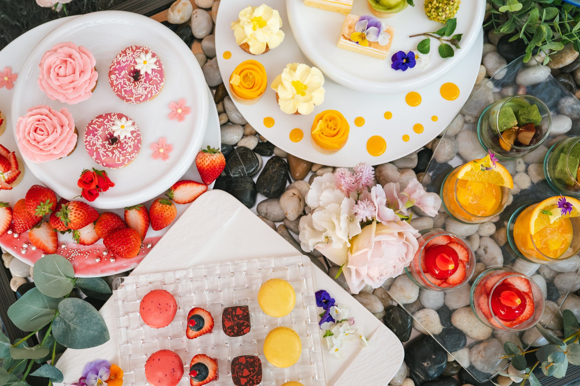 スイーツ:フルーツタルト・ストロベリーコーン・ドーナツ・マフィン・レモンムース・ピスタチオムース・フラワーゼリー・カシスオランジュ・マカロン・和菓子など全13種類
