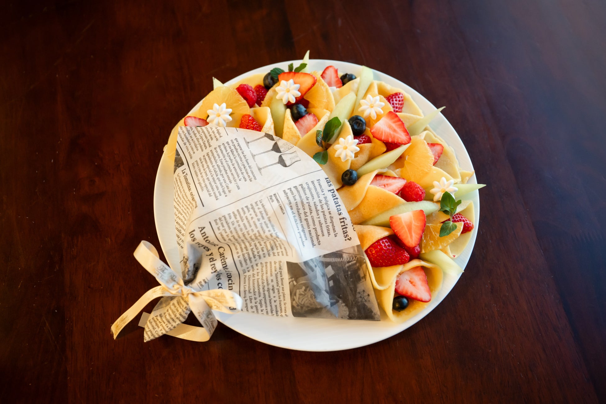 花束をモチーフにした、たくさんのフルーツで彩られたフィンガーフードのクレープをご用意いたします。※2日前までのご予約制