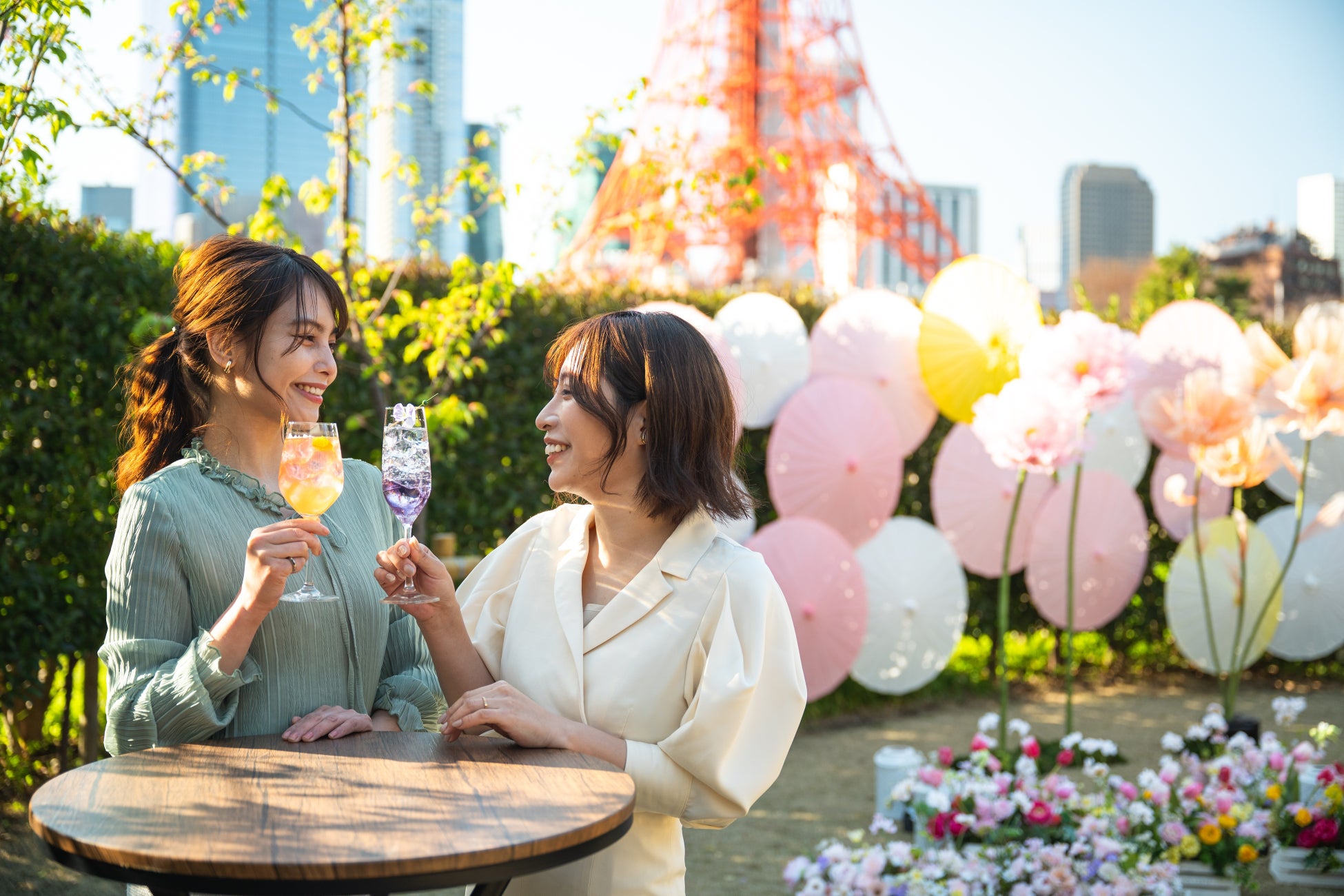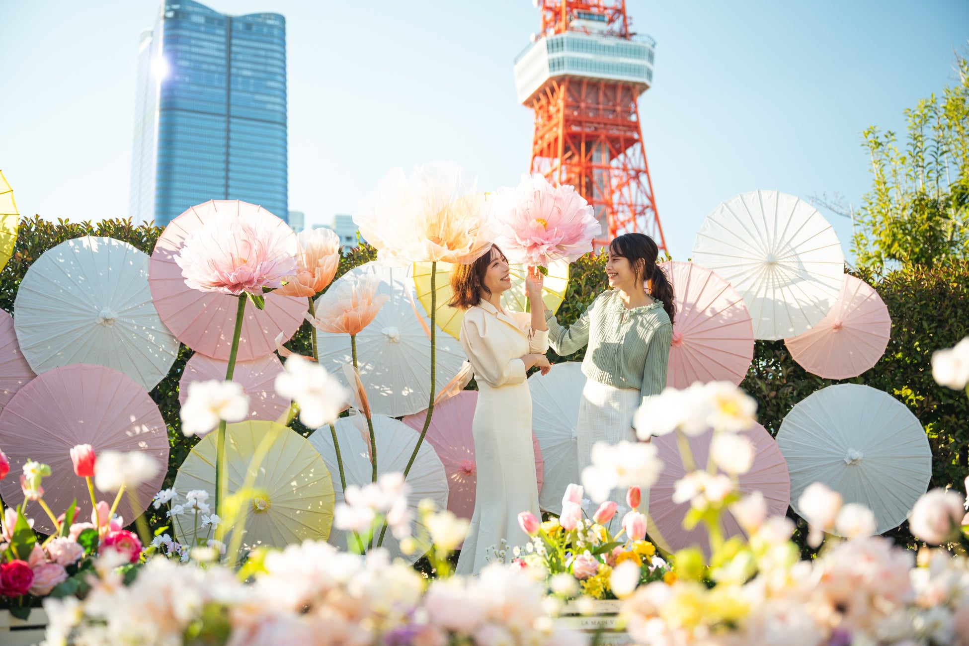 庭園は、桜色やホワイトの和傘の周りに春の花のジャイアントフラワーを飾り、東京タワーを背景に春らしい絶景フォトスポットを設置。和と洋が融合した花咲く庭園で、最高の1枚を撮影いただけます。