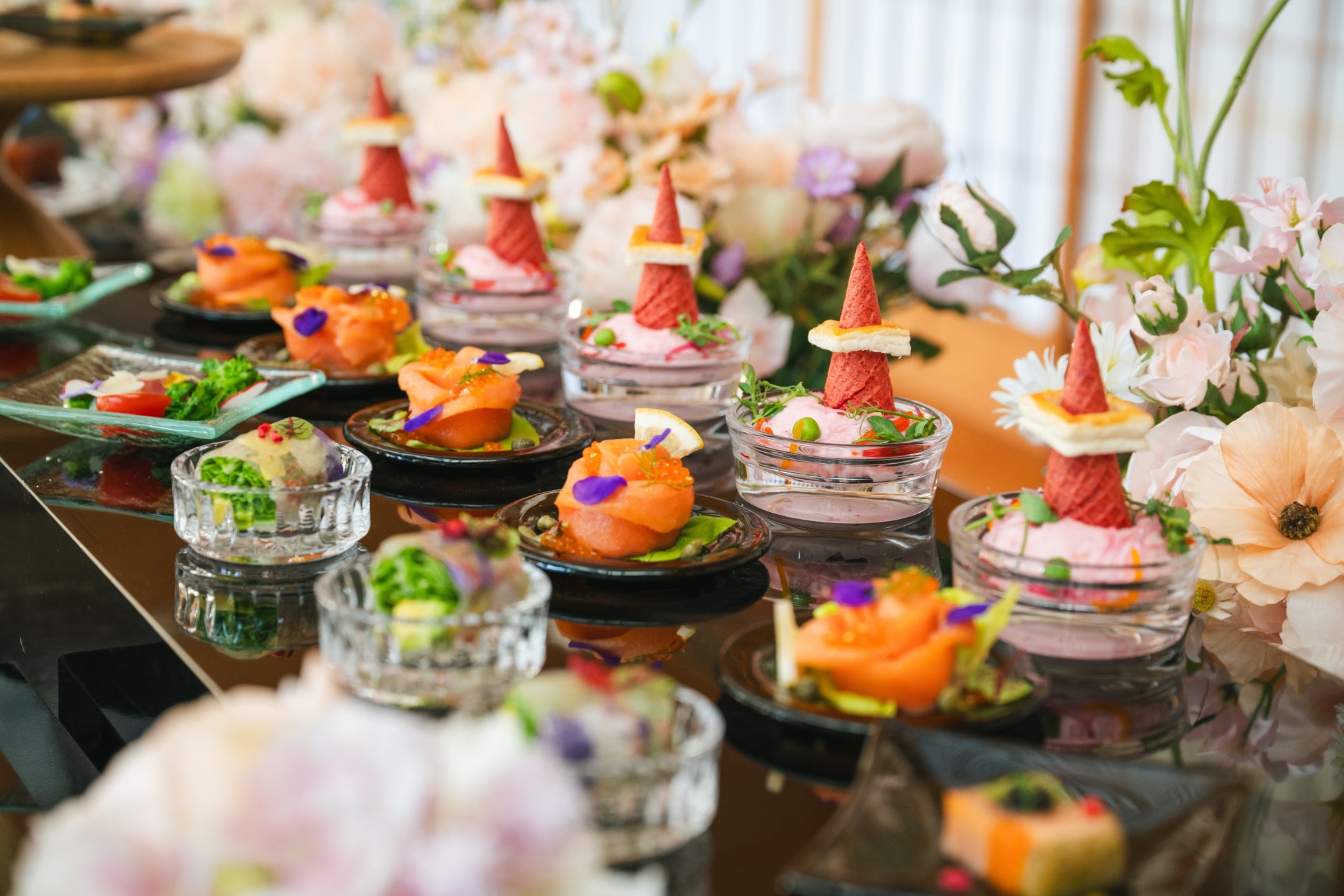 タパス:スモークサーモンローズ・タルティーヌ・シャルキュトリー・生春巻き花の舞・サーモンと野菜のプレッセ・菜の花ブーケ・タワーポテトサラダ