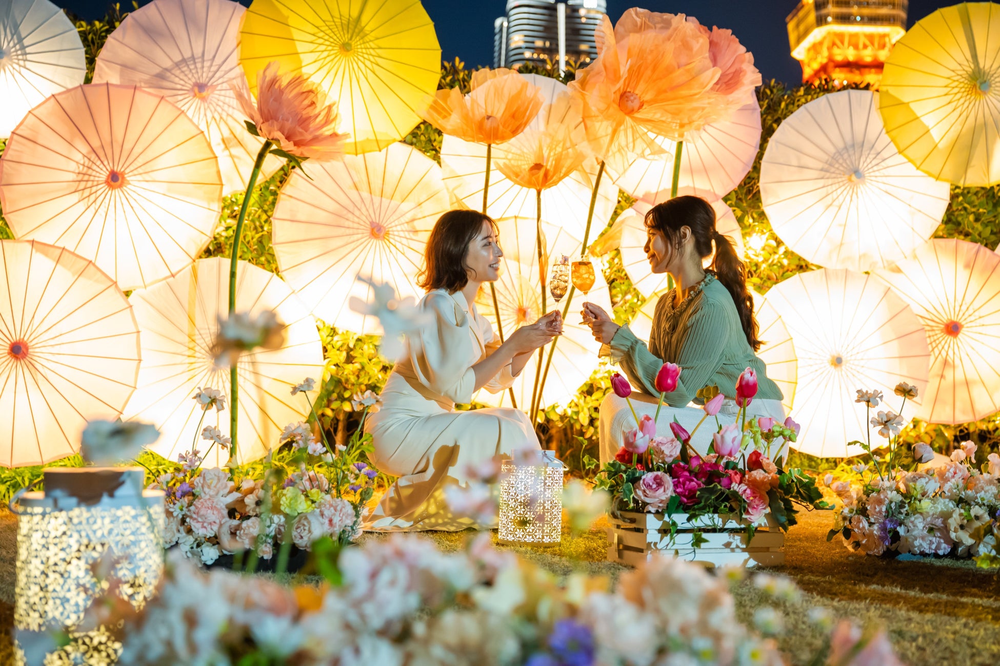 予約なしで立ち寄れる庭園BARで春景色をお楽しみいただけます。ピンク・白などの和傘やジャイアントフラワーをライトアップしたキュートなフォトスポットで春の思い出の1ページを。