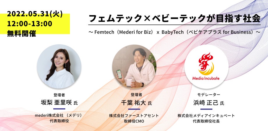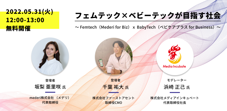 【5/31(火)無料開催:フェムテック(FemTech)×ベビーテック(BabyTech)が目指す社会について】mederi・坂梨社長/ファーストアセント・千葉CMO/メディアインキュベート・浜崎登壇