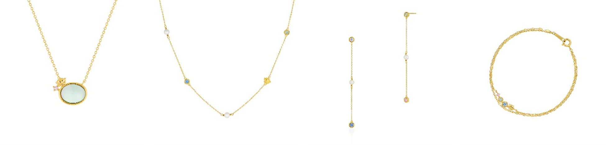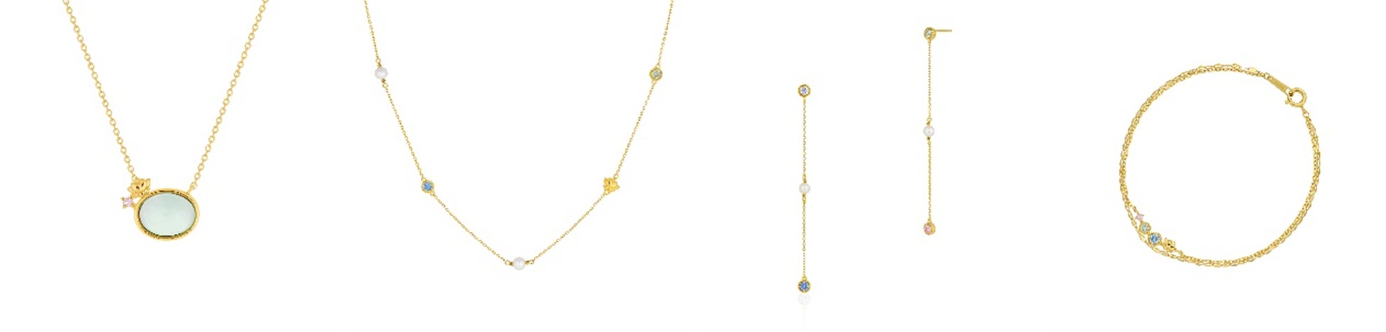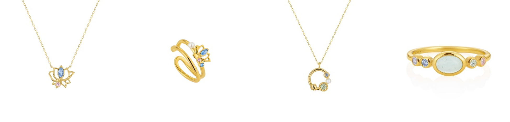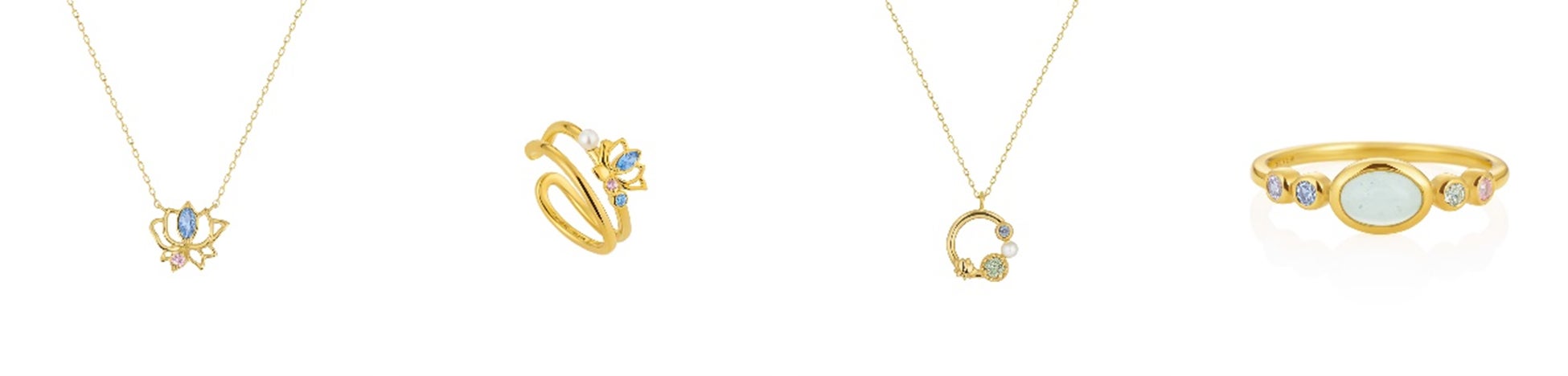 《睡蓮》1897年をイメージし、水面に浮く睡蓮の花を、華やかな艶めきのイエローゴールドで表現したジュエリー。優しいブルーカラーのスピネルをメインに据えつつ、すっきりとした印象の美しい蓮の花を描いたネックレスや、絵の具の色を重ねるように鮮やかなカラーストーンを添えたネックレスやリングが揃います。