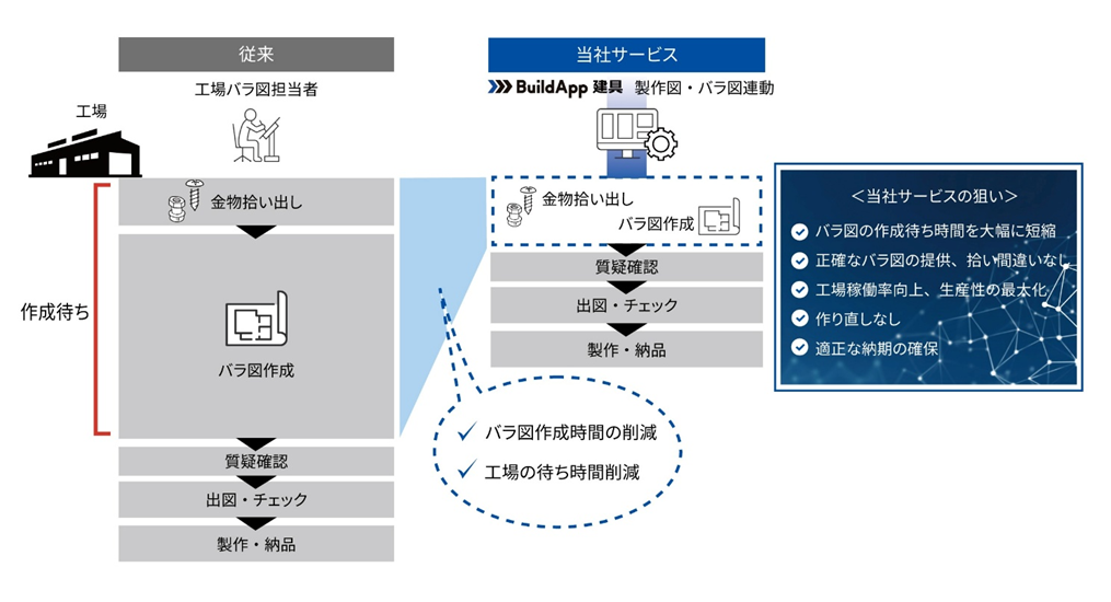 BuildApp(ビルドアップ)で建設DXに取り組む野原グループ株式会社(本社:東京都新宿区、代表取締役社長:野原弘輔)は、鋼製建具工事における作図業務の効率化と品質標準化を目的に、BuildApp建具の新サービスとして、建具サブコン様と鋼製建具製作工場様を対象に「製作図・バラ図連動サービス」の商用提供を開始します。