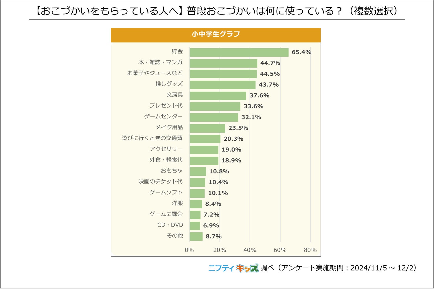 最も多い回答は「貯金」で、続いて「本・雑誌・マンガ」「お菓子やジュースなど」がほぼ同票、次に「推しグッズ」がランクインしました。