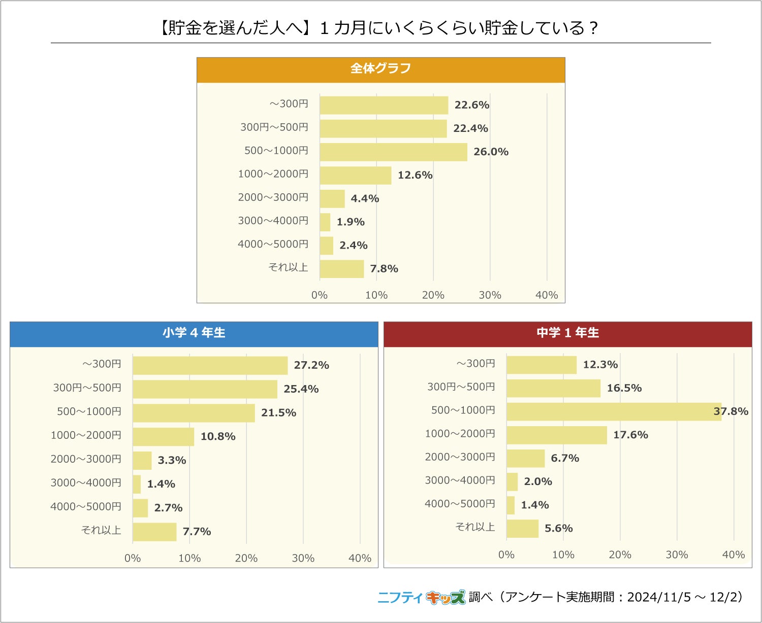 小学生では「~300円」、中学生では「500~1000円」が1位でした。もらう額が大きくなると、貯金額も増えるのかもしれません。