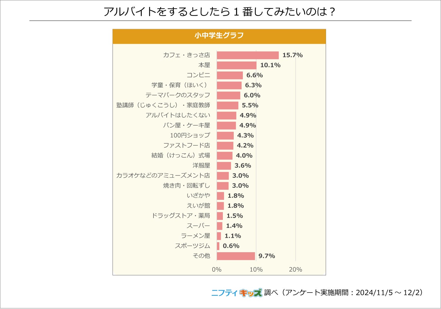 また、アルバイトができる年齢になったらなにをしてみたいかを聞いた質問では、1位は「カフェや喫茶店」、2位が「本屋」でした。