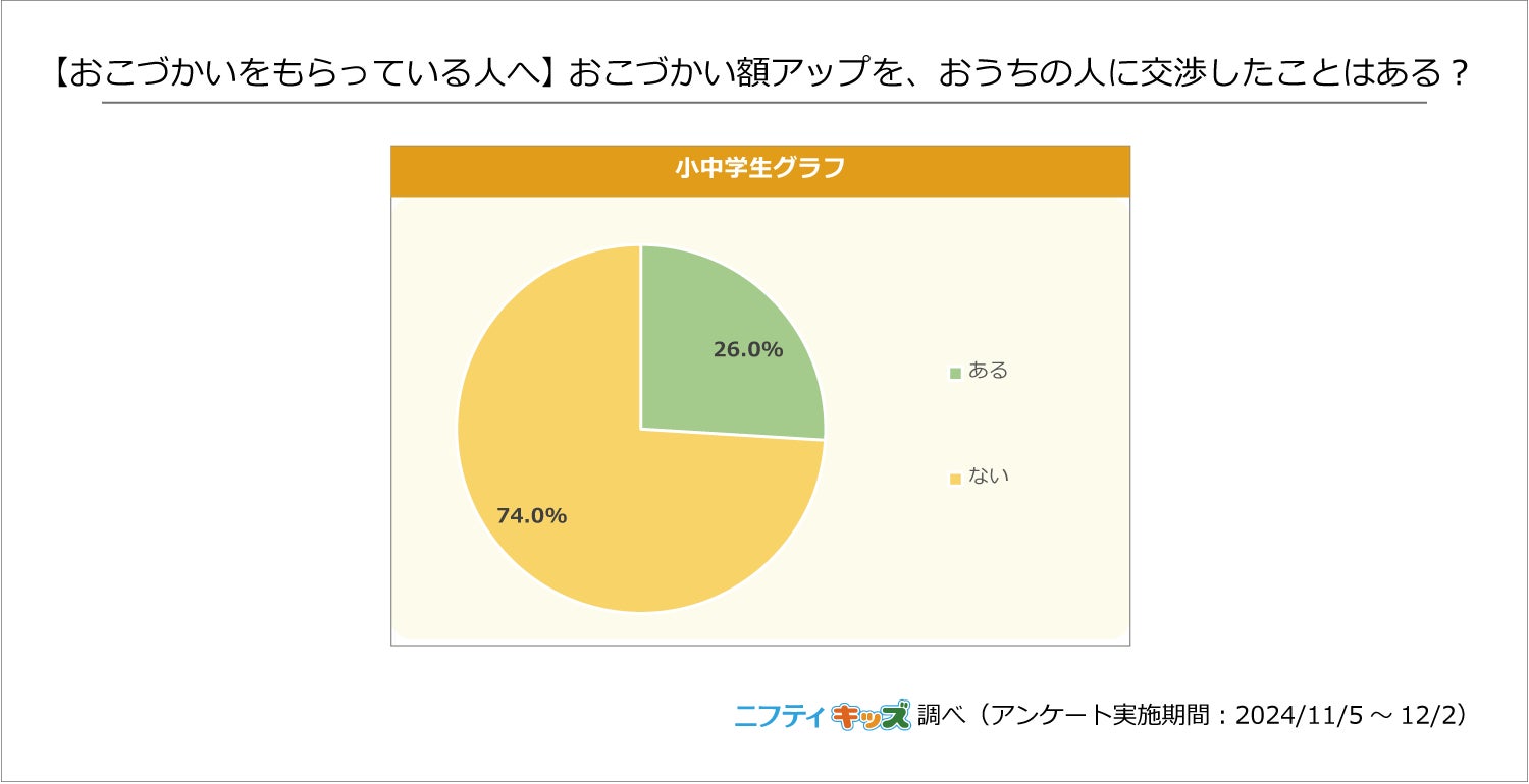 交渉したことがある人は小中学生の約4分の1で、ほとんどの人がもらったおこづかいの額を受け入れているようです。
