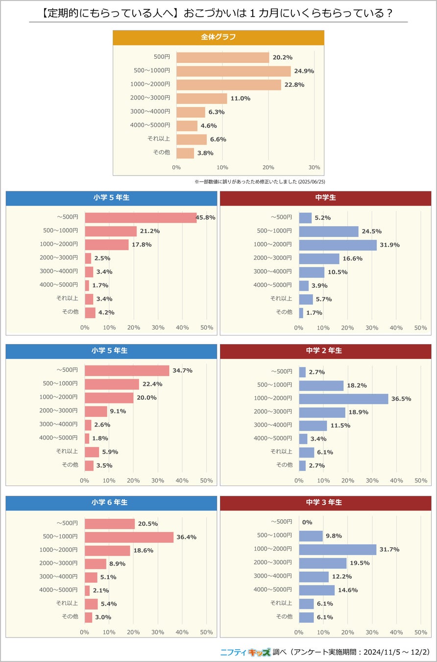 おこづかいをもらっている小中学生は全体の約8割で、おこづかいの金額で最も多かった金額は、小学生は月に500~1,000円、中学生は月に1,000~2,000円となりました。