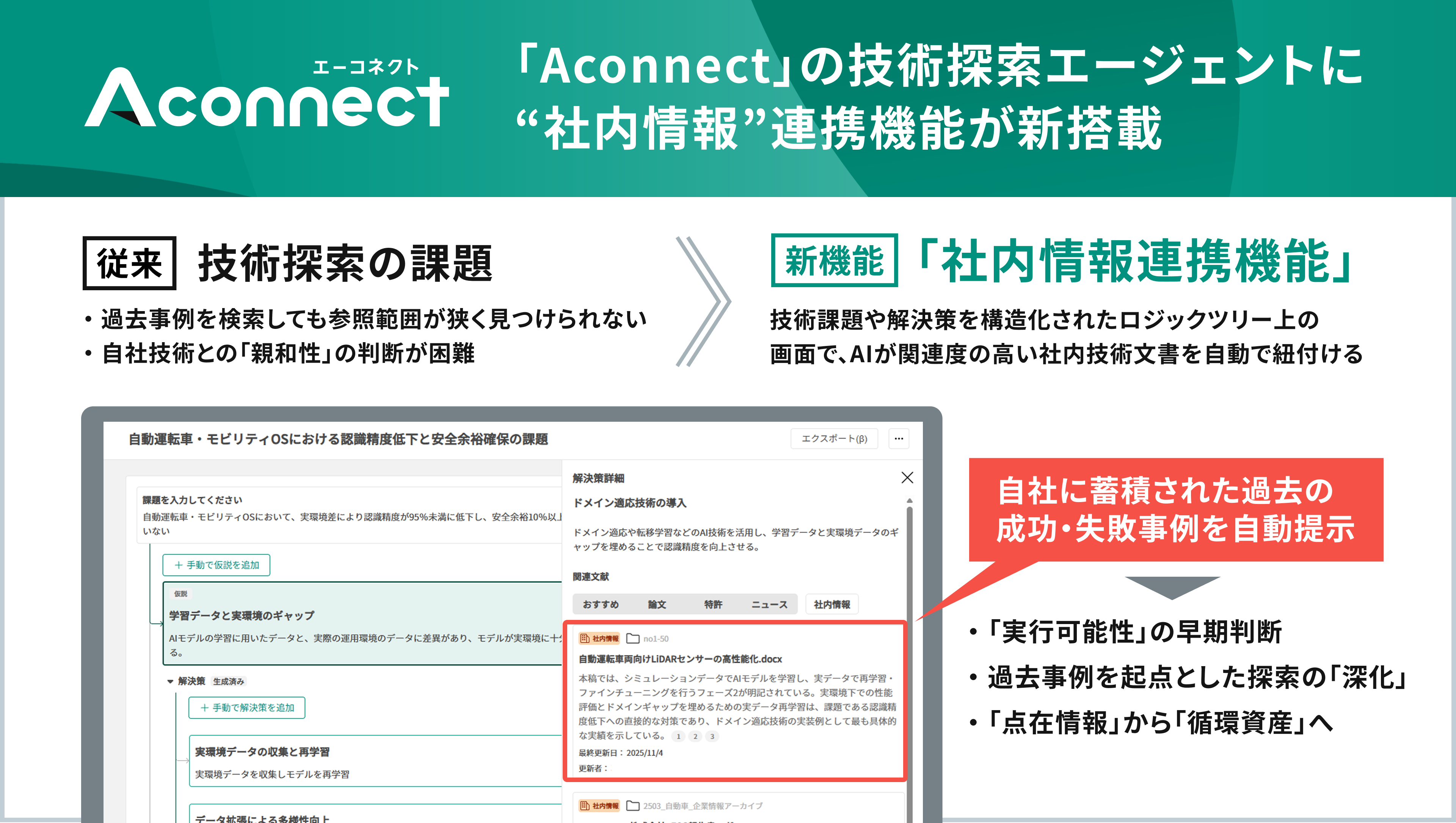 「Aconnect」の技術探索エージェントに社内情報連携機能を新搭載 蓄積された自社知見を技術/市場課題の要因仮説立てや解決策に活用可能に