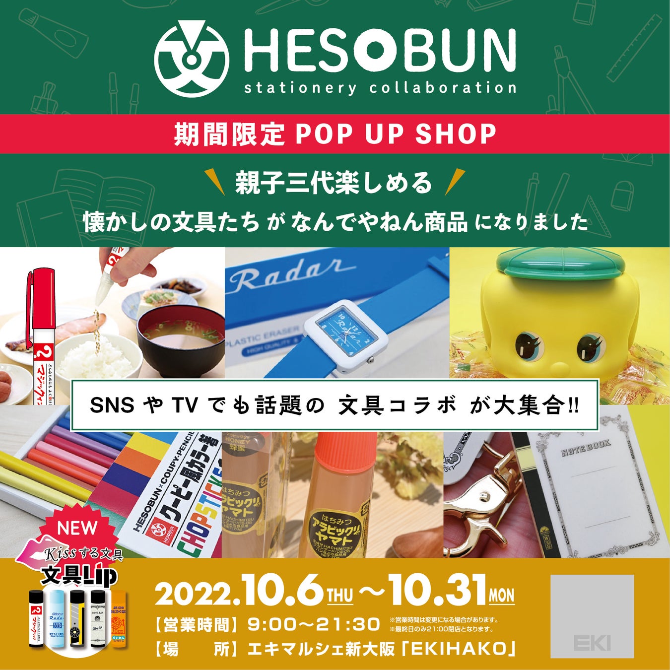 オリジナル商品の企画・制作・販売を軸に、企業・組織のトータルブランディングを手掛ける株式会社ヘソプロダクション(本社:大阪市福島区・代表取締役:稲本ミノル)が展開する「なるへそ」がある文具のコトづくりproduct『へそ文-HESOBUN-』のポップアップショップが、2022年10月6日(木)から10月31日(月)までの間、JR新大阪駅在来線改札内 エキマルシェ新大阪「EKIHAKO」にて期間限定オープンいたします。