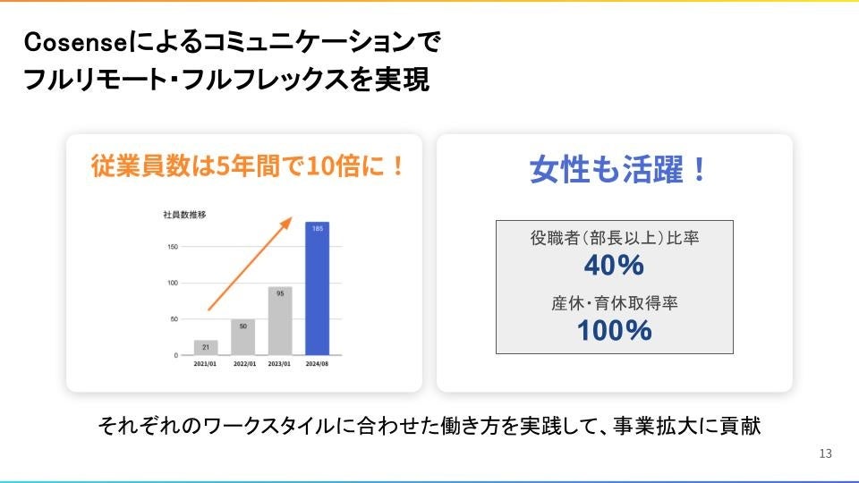 今回の大会では、地方在住者や子育て世代、ダブルワーカーなどの多様な事情を持つ従業員も活躍できるよう、フルリモート・フルフレックスといった柔軟な働き方を導入・実践している点をプレゼンテーションしました。この取り組みにより、当社は女性の役職者比率40%、従業員満足度(ES)98%を達成し、事業も10倍に拡大しています。