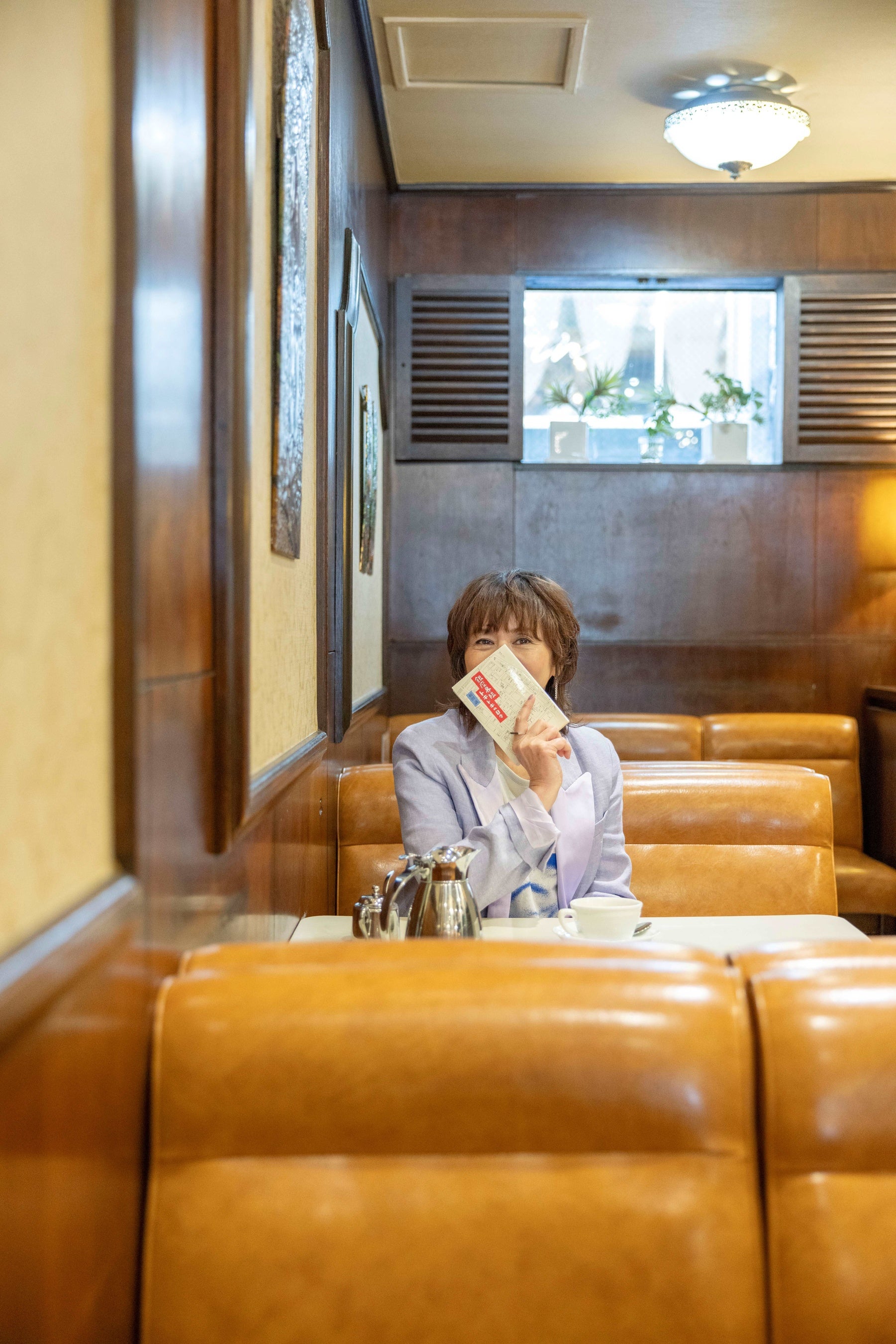春らしい薄紫色のセットアップを纏って、颯爽と銀座の街に現れた小泉今日子さん。まずは、創業113年、銀座を代表する老舗喫茶店〈カフェーパウリスタ〉へ。1階奥の穴場スペースにある、年季の入った茶色のソファに座り、本を片手にお茶タイム。和田誠の『銀座界隈ドキドキの日々』を手にしながら、「銀座にまつわる本ってたくさんありますよね。読んで、気になる場所を訪れてみるのも面白そう」と話します。