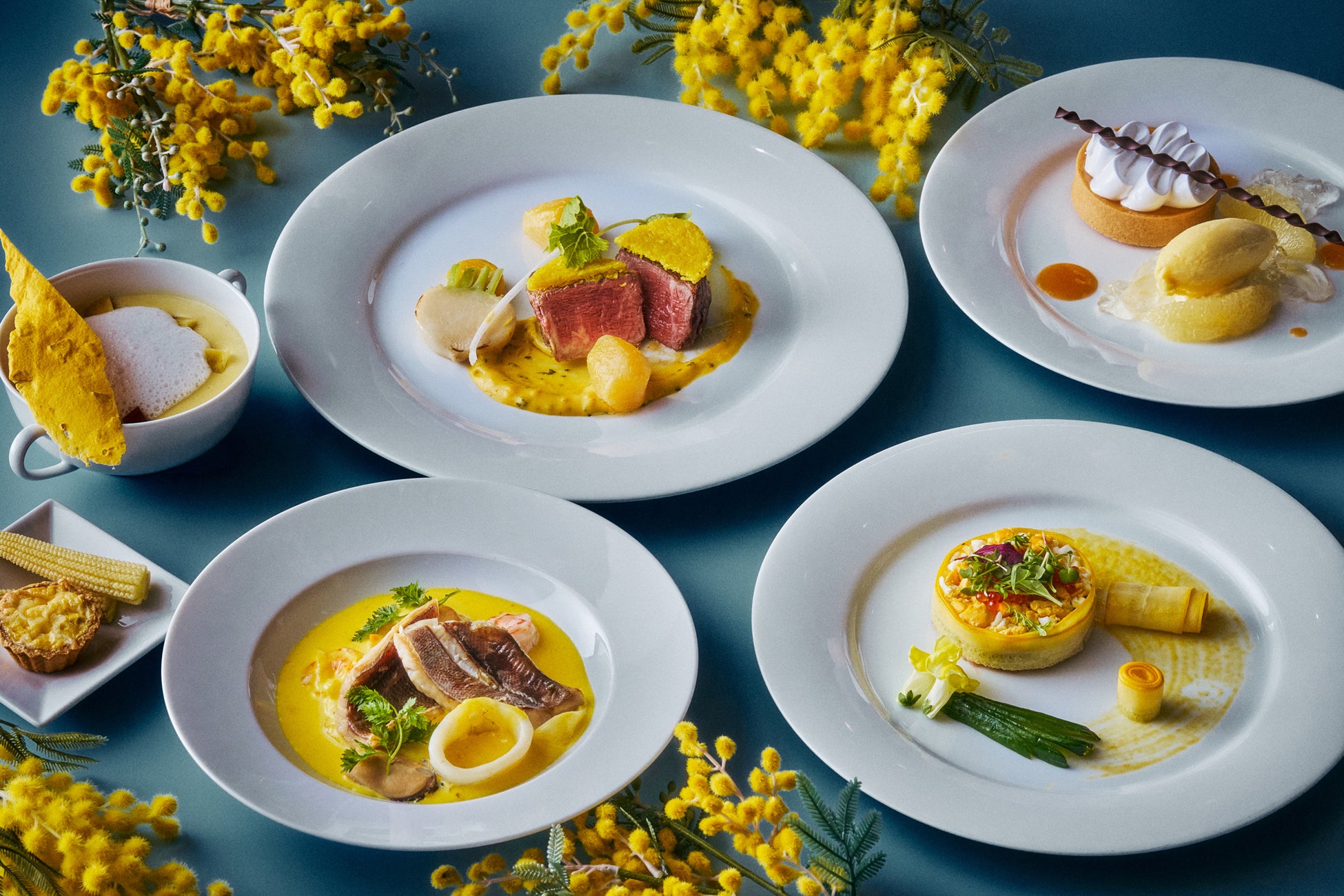 アミューズからデザートまですべてのメニューが鮮やかなミモザイエローで染められたディナーコースをお楽しみいただけます。桜チップで約8時間燻製してつくる自家製のスモークサーモンと、フランスの伝統料理であるミモザエッグでつくる前菜や、鮮やかな黄色が特徴的なフランス伝統の「ベアルネーズソース」と、黄にんじんやスウェーデンカブといったグリルした黄色い野菜を添える牛フィレ肉のロースト、爽やかな香りが広がるレモンタルトなど、6皿をご用意いたします。