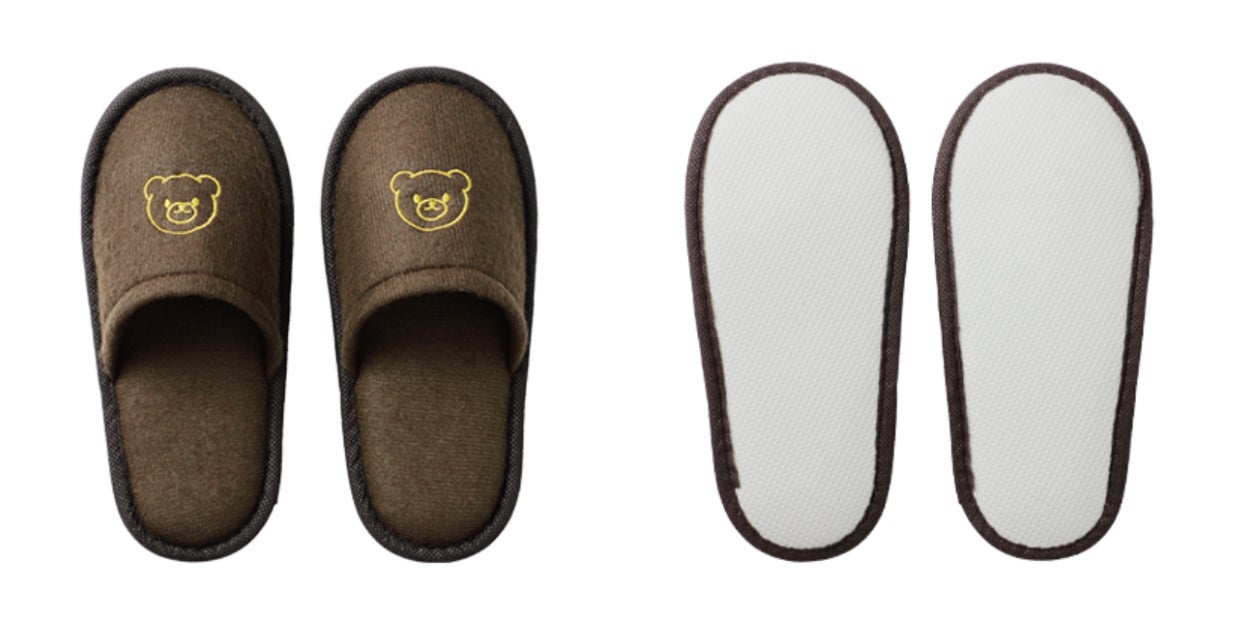 甲部分にはワンポイントとしてくまの刺繍を施しました。また、紙帯にはホテルのロゴや名称などのオリジナル名入れが可能なため、施設独自の特注アメニティとして展開いただけます。