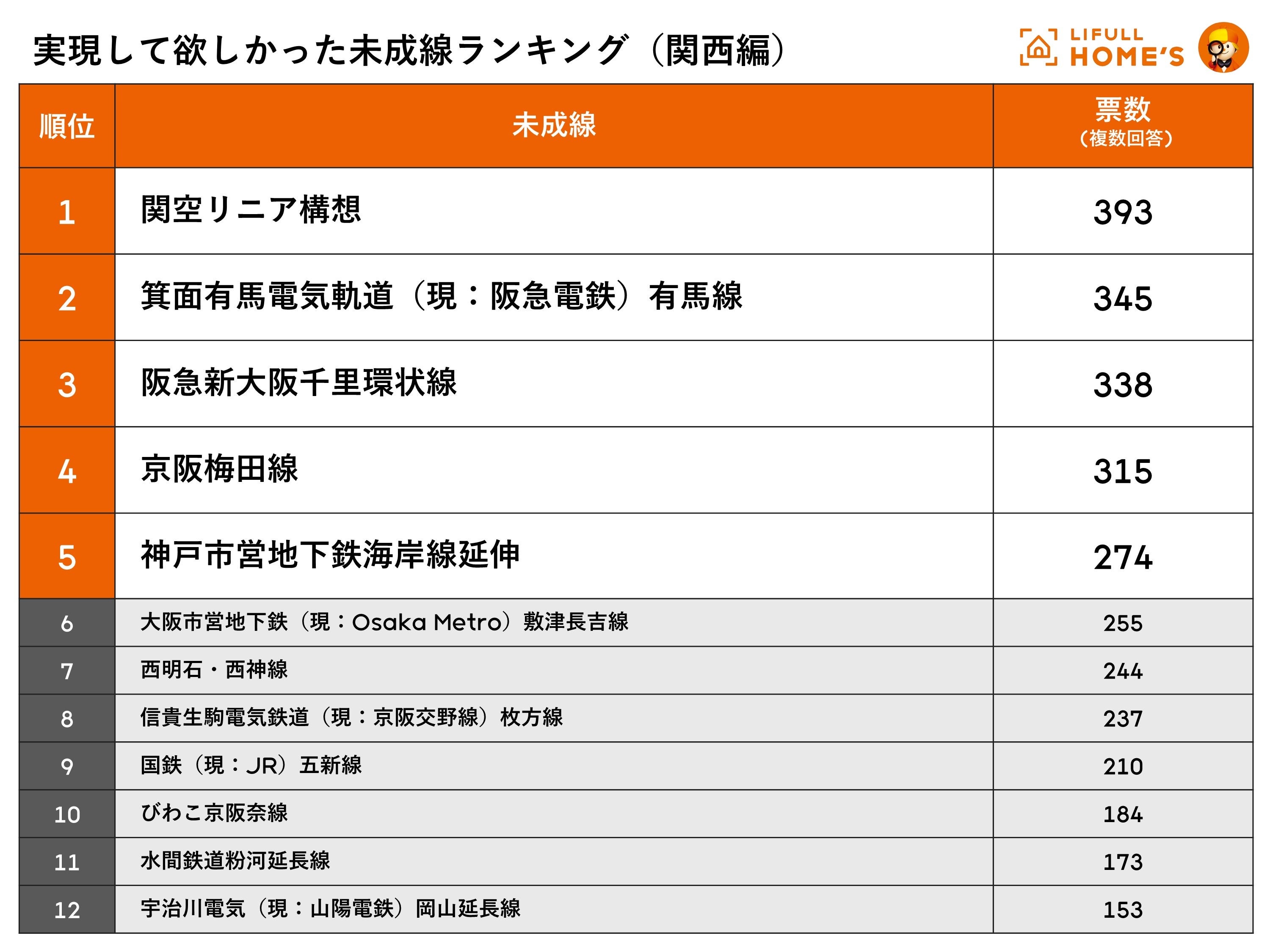 LIFULL HOME'Sでは、関西の主要な12の「未成線」について、京都府・大阪府・兵庫県在住の20~60代男女1,100人にアンケート調査を実施しました。そのなかでも得票数の多かった「実現してほしかった未成線」TOP5を紹介します。