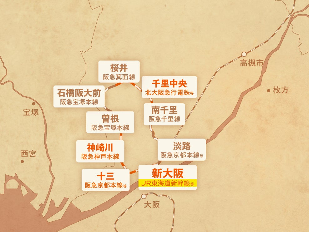 阪急宝塚本線や京都本線の混雑緩和や、新幹線が発着する新大阪駅へのアクセスを目的に計画した路線によって、大阪北部の千里ニュータウンや新大阪駅を循環する環状線の計画が形作られました。実現していれば、北摂エリアの東西方向の移動や、阪急沿線から新大阪駅へのアクセスが便利になっていたと考えられます。