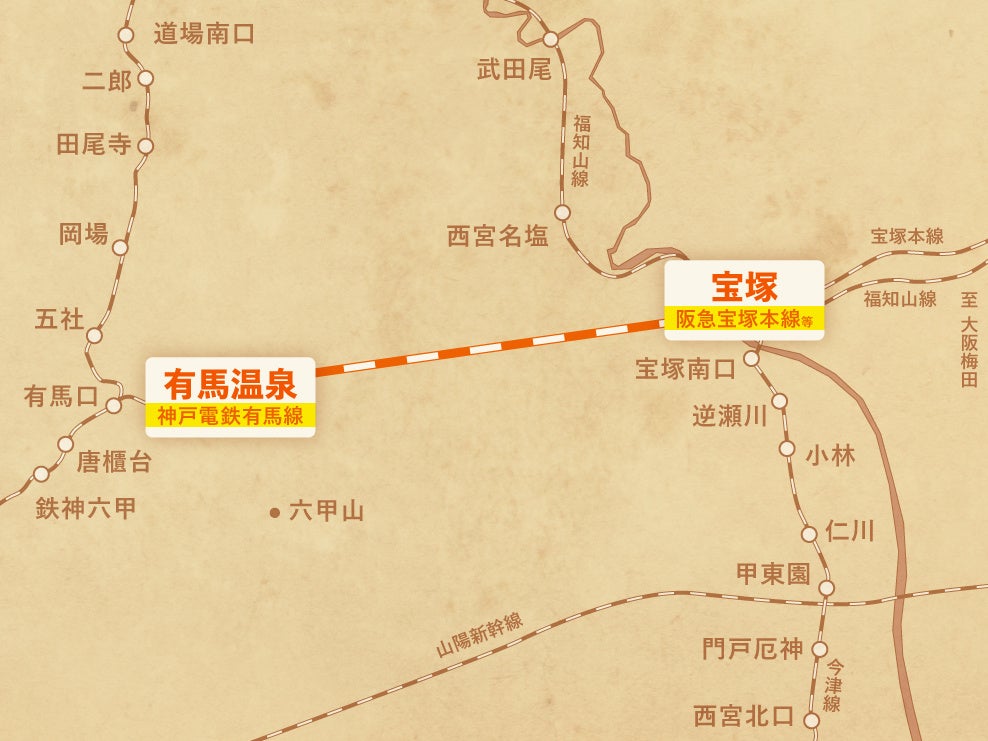 阪急電鉄の前身である箕面有馬電気軌道はかつて、宝塚と有馬を結ぶ鉄道を計画していました。有馬には日本三古泉とのひとつ「有馬温泉」があり、大阪からは電車で神戸または三田を経由してアクセスできますが、この路線が実現していたら、大阪から有馬温泉へ直線的にアクセスできていたことになります。
