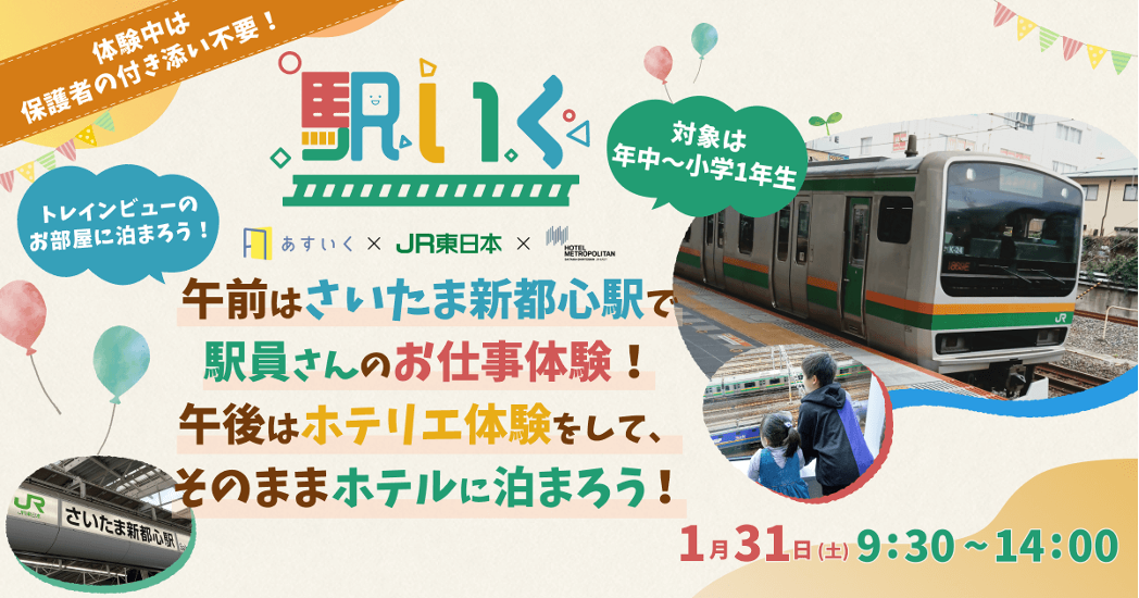 一時保育検索・予約サービス「あすいく」を運営する株式会社あすいく(代表取締役:幸脇啓子)、JR 東日本スタートアップ株式会社(代表取締役社長:柴田裕)、東日本旅客鉄道株式会社大宮支社(執行役員大宮支社長:石井剛史)、日本ホテル株式会社ホテルメトロポリタンさいたま新都心(総支配人:櫻井浩一)は連携して、「駅いく in さいたま新都心 駅員&ホテリエ職業体験・自由時間ステイ」を 2026年1月31日(土)にご提供します。