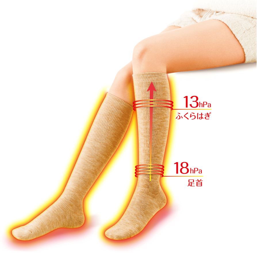 足首から上へいくほど圧力が低くなる設計(足首21hPa、ふくらはぎ16hPa、太もも11hPa)で
