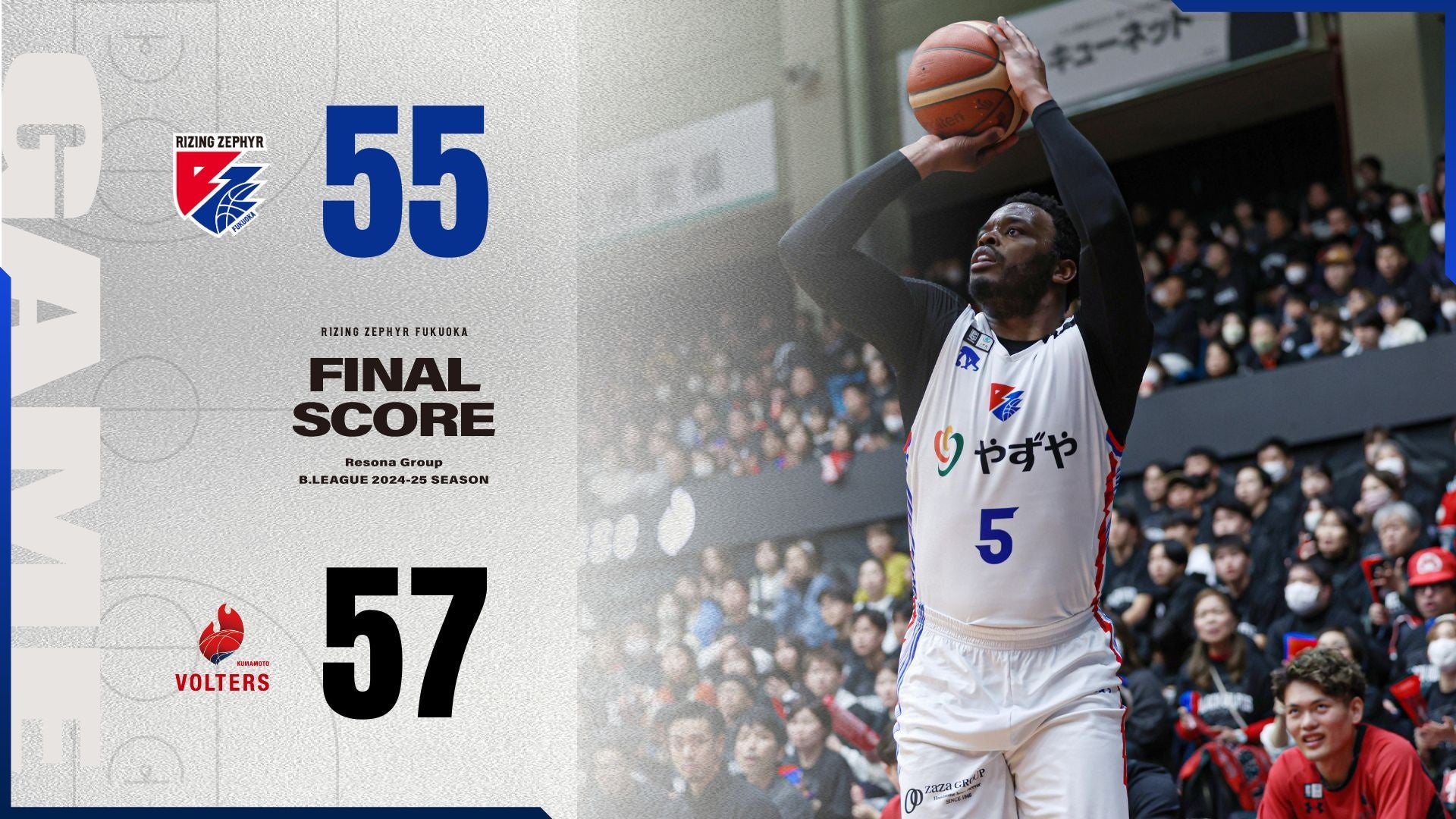 2025年2月16日(日)に開催された、りそなグループB.LEAGUE 2024-25シーズン【熊本ヴォルターズvs.ライジングゼファーフクオカ】の結果は、 “熊本57-55福岡”で福岡の勝利となりました。