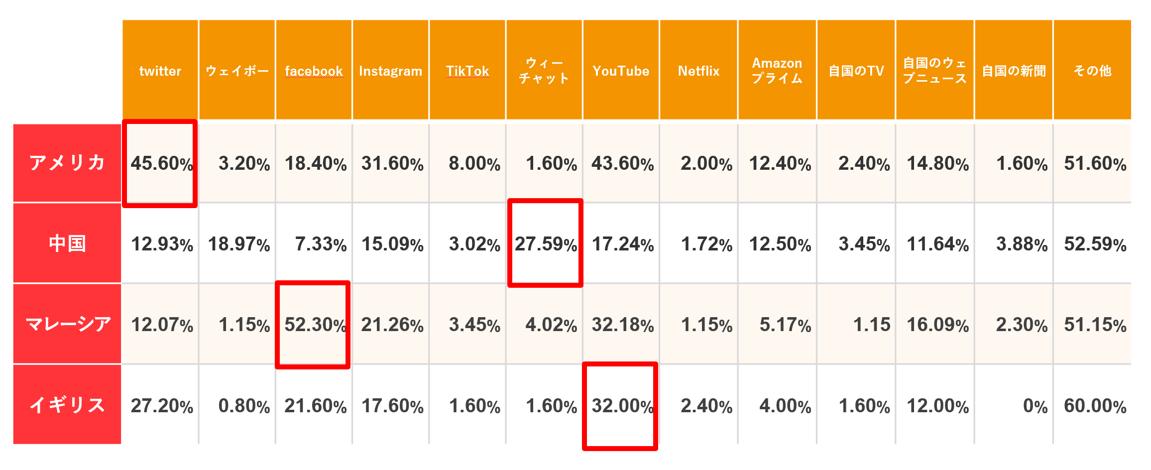一方、自国のニュースなどを参考にしている方は少なく、twitter、facebook、YouTubeという世界共通のプラットフォームから日本の情報を参考にしていることわかる結果となりました。