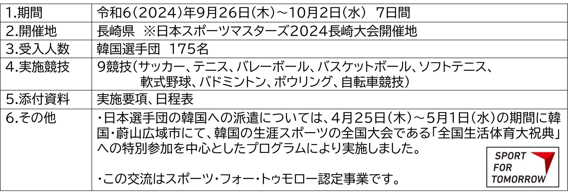 スポーツを「する」「みる」「ささえる」ための環境づくりを行うJSPO(正式名称:公益財団法人日本スポーツ協会 東京都新宿区/会長 遠藤 利明)は、来る令和6(2024)年9月26日~10月2日に長崎県にて、韓国選手団を迎えて標記交流を実施します。韓国選手団は、同地で開催される「日本スポーツマスターズ2024長崎大会」に特別参加します。