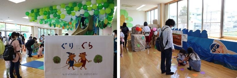 館内1階では、子どもたちに親しみのある絵本の世界に没入できる空間を用意。登場人物になりきって、物語のワンシーンを体験します。造作物は廃材や廃紙を活用しており、楽しみながら、ごみを減らすSDGsの考え方が伝わるよう工夫されています。
