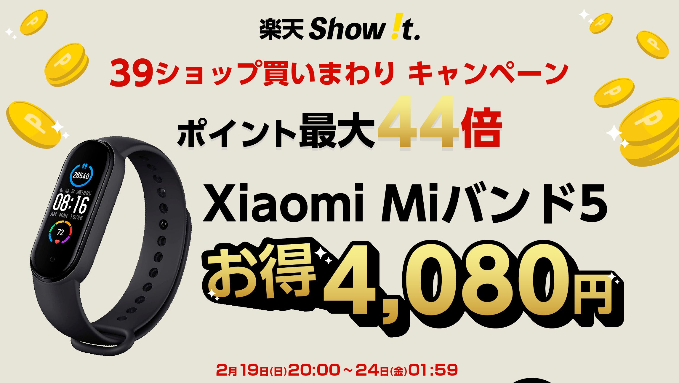 楽天「Show !t」でポイントがザクザクたまる!シャオミMiバンド5購入でポイント20倍プレゼント、さらに2月24日20時開始、楽天お買い物マラソンで全商品ポイント10倍プレゼントを実施。