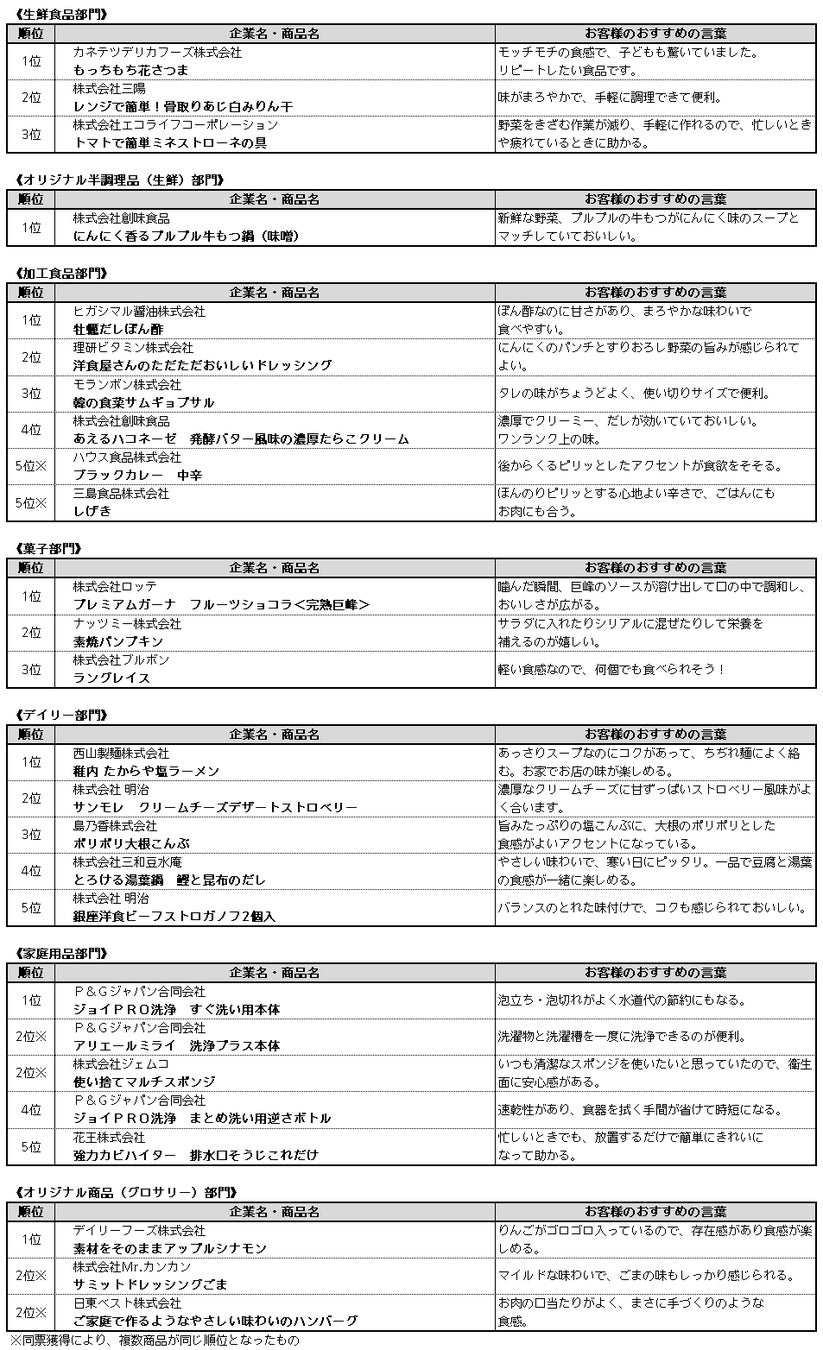入賞商品はサミットで昨年1年間に販売した新商品の中から、サミットお客様モニター約90名による人気投票で順位を決定したものです。入賞商品は2月5日からチラシによる紹介セールを実施いたします。
