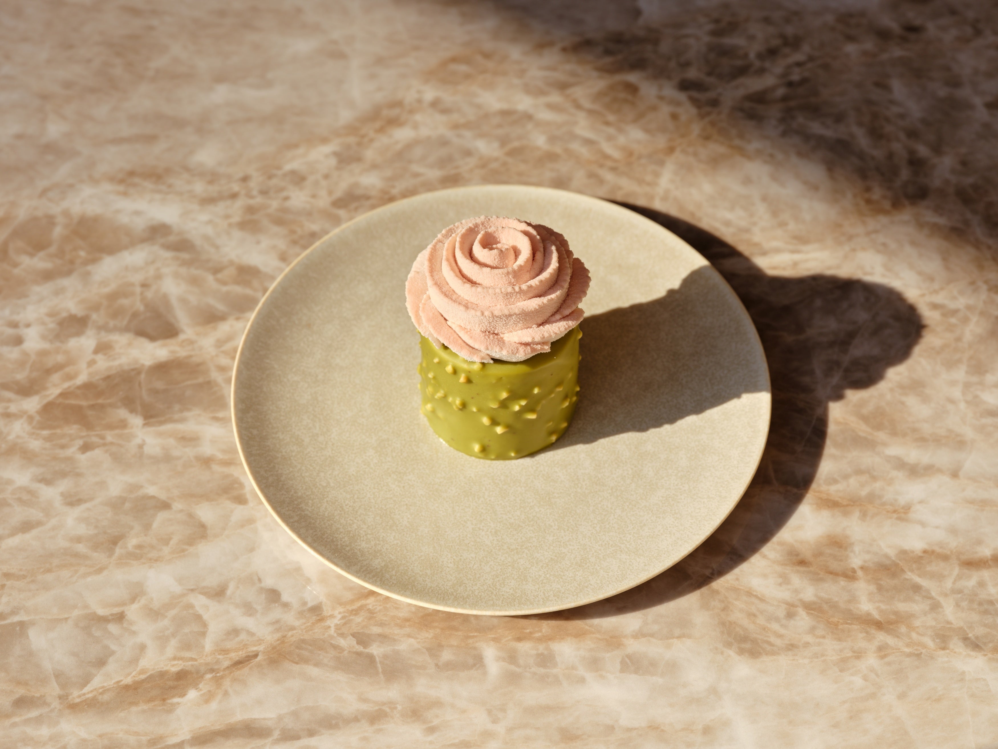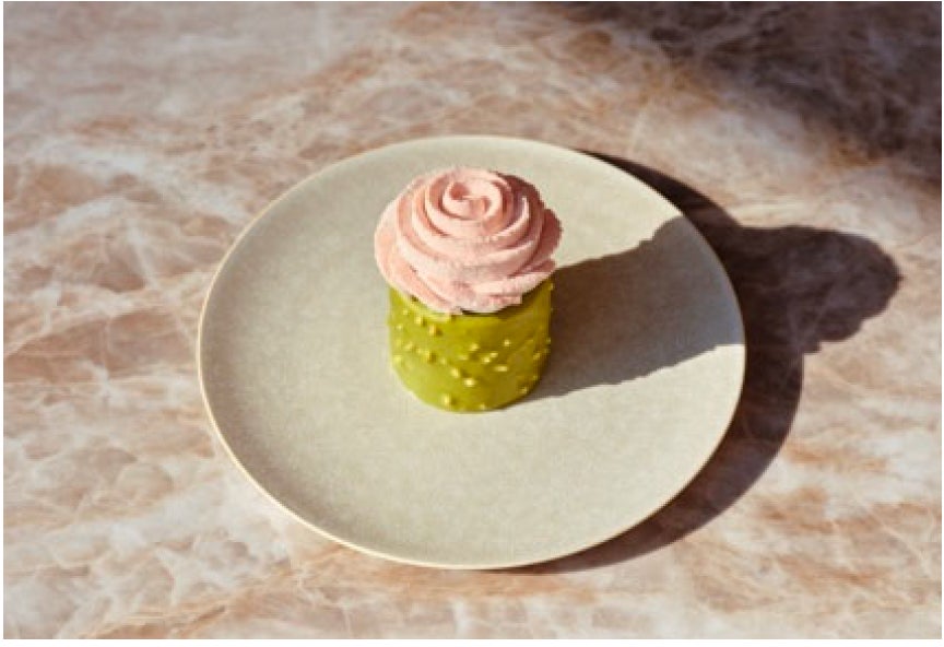 サンスクリット語で「薔薇」を意味する「タルニー」は、薔薇の花を模した華やかなデザイン。春の「タルニー」は、桜味のクリームで作った愛らしい花びらになって登場します。オレンジのビスキュイを土台に、チェリーのジュレと白あんのムースを中に忍ばせ、抹茶のムースで包みました。さらに、抹茶チョコレートと砕いたアーモンドでコーティングし、和と洋が融合した深みのある味わいが魅力です。
