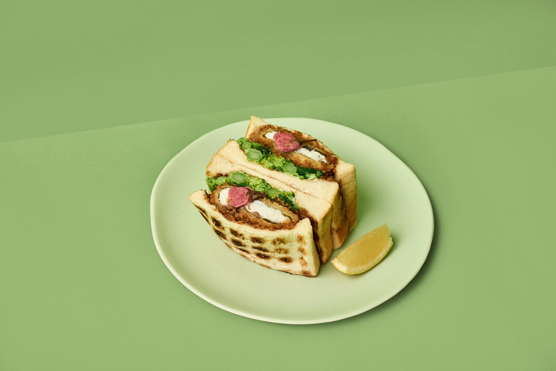旬の桜鯛を桜の葉の塩漬けで巻いてフライにし、ほろ苦い菜花と一緒にサンドしました。桜鯛は春になると産卵期を迎え、体色が桜色になることからそう呼ばれています。香ばしく焼き上げた自慢のトーストと一緒に、春の香りと味わいをお楽しみください。